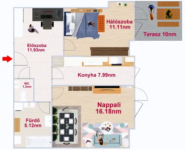 + A lakás nettó 54nm, illetve ezen kívül tartozik hozzá egy 10nm-es terasz, ami le is választható.