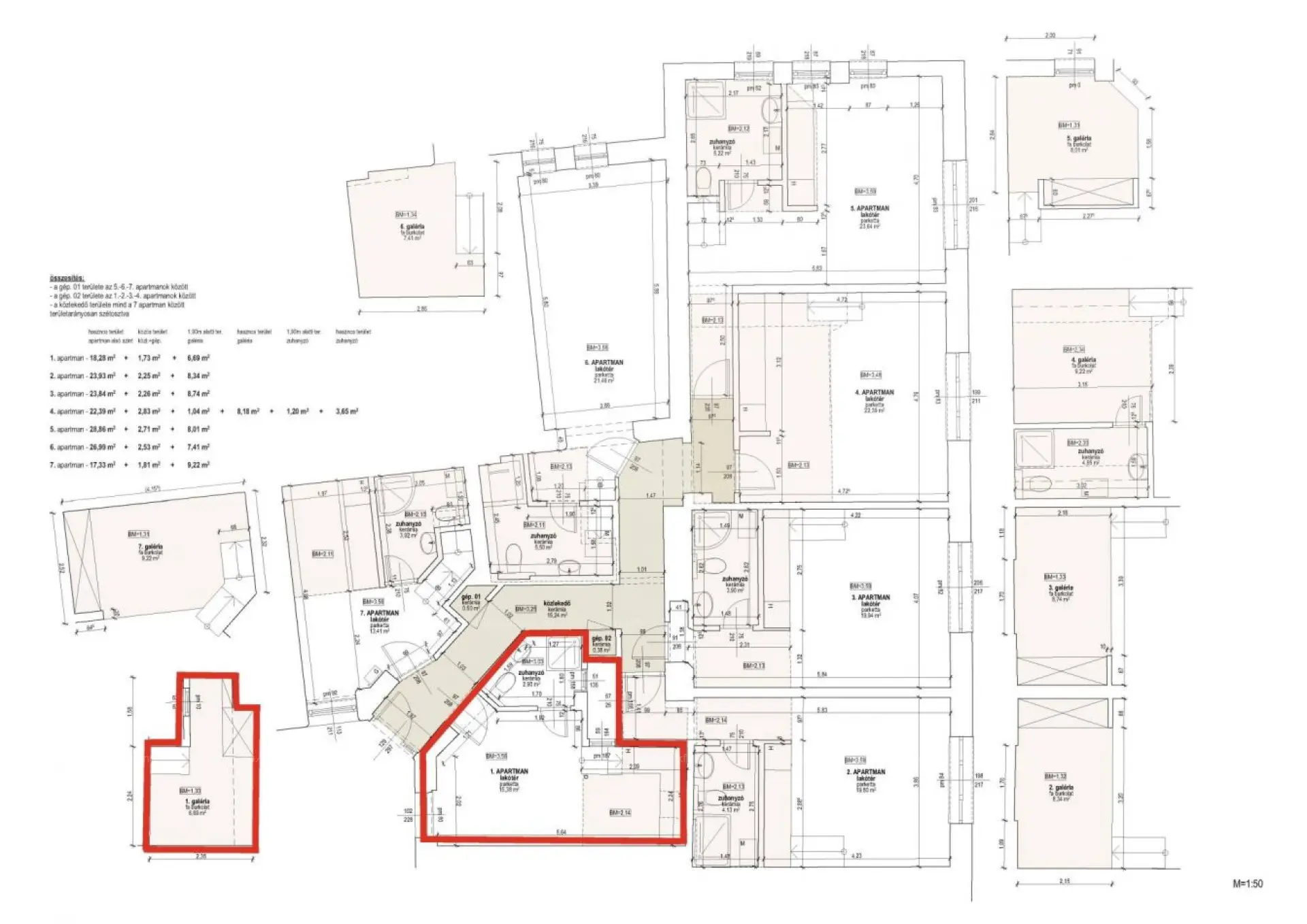 Az ingatlan 1/1 tulajdonú, tehermentes, osztatlan közös tulajdon, ügyvédi megosztással, egy két nagyobb lakásból kialakított, összesen hétlakásos kialakítás részeként jött létre, az alaprajzon pirossal jelölve egyértelműen beazonosítható, hogy pontosan melyik lakás kerül értékesítésre.