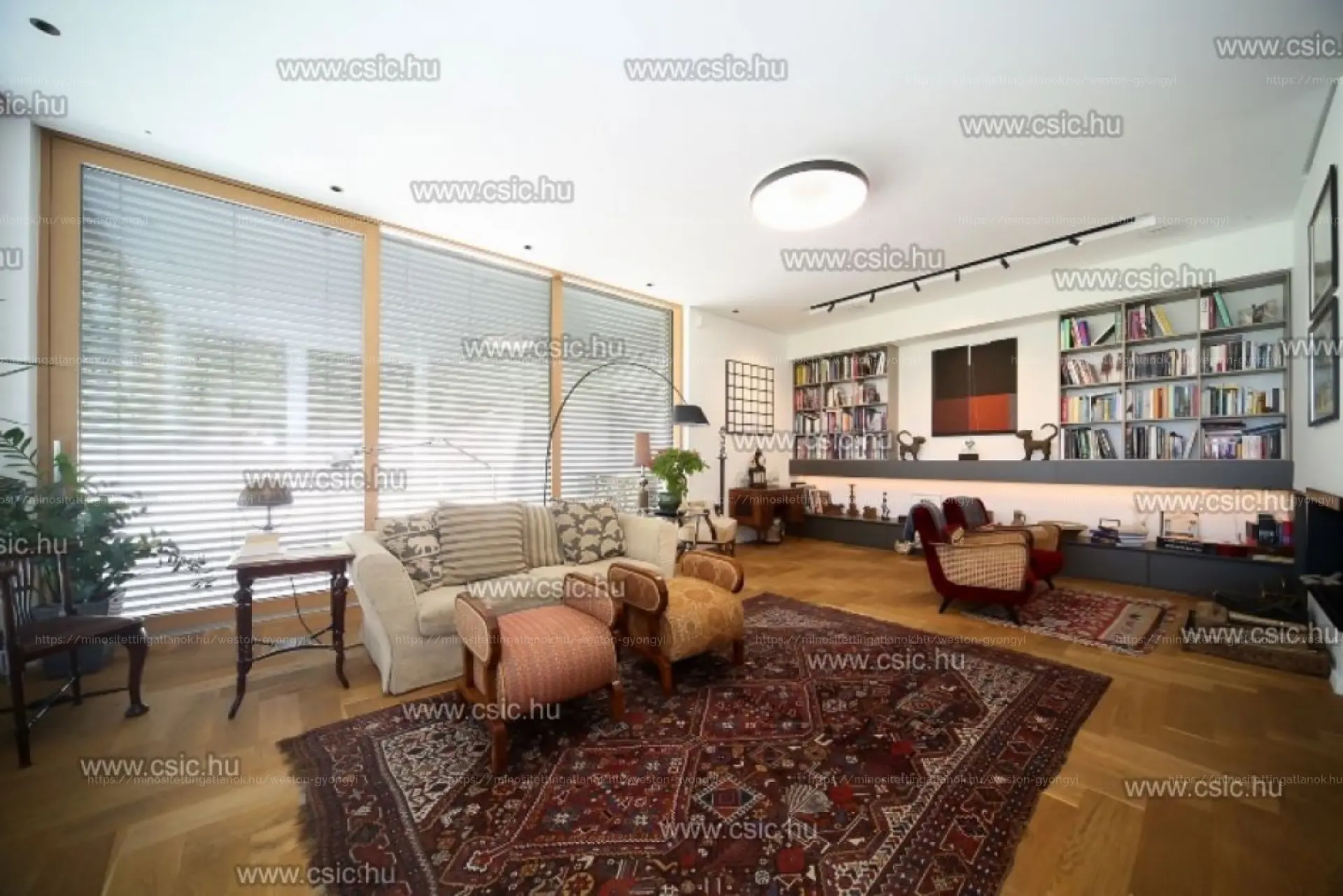 A belső kétszintes, 273 nm-es ház egy 1743 nm-es, gondozott telken fekszik, ahonnan lenyűgöző kilátás nyílik Budára és a Pilisi dombokra. A nappali, étkező és konyha együttesen közel 80 négyzetmétert tesz ki, így nemcsak a fény, hanem a tér is szabadságot ad. A természet közelsége mindennapos élmény, a nappaliból és a teraszokról elénk táruló panoráma lenyűgöző – Buda és a Pilis dombjai egész évben megnyugtató látványt nyújtanak.