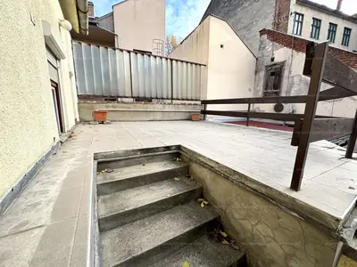 Az ingatlan kialakítását tekintve, egy tágas 22,7 m²-es nappali, két külön bejáratú, teljes értékű hálószoba, kényelmes előszoba, tágas konyha, étkező és kamra. Különlegessége az ingatlannak, közvetlen a belső udvarban, a lakás előtt található garázs tetején, kialakítottak egy 20 m²-es teraszt is.