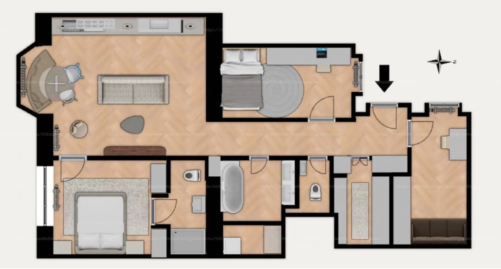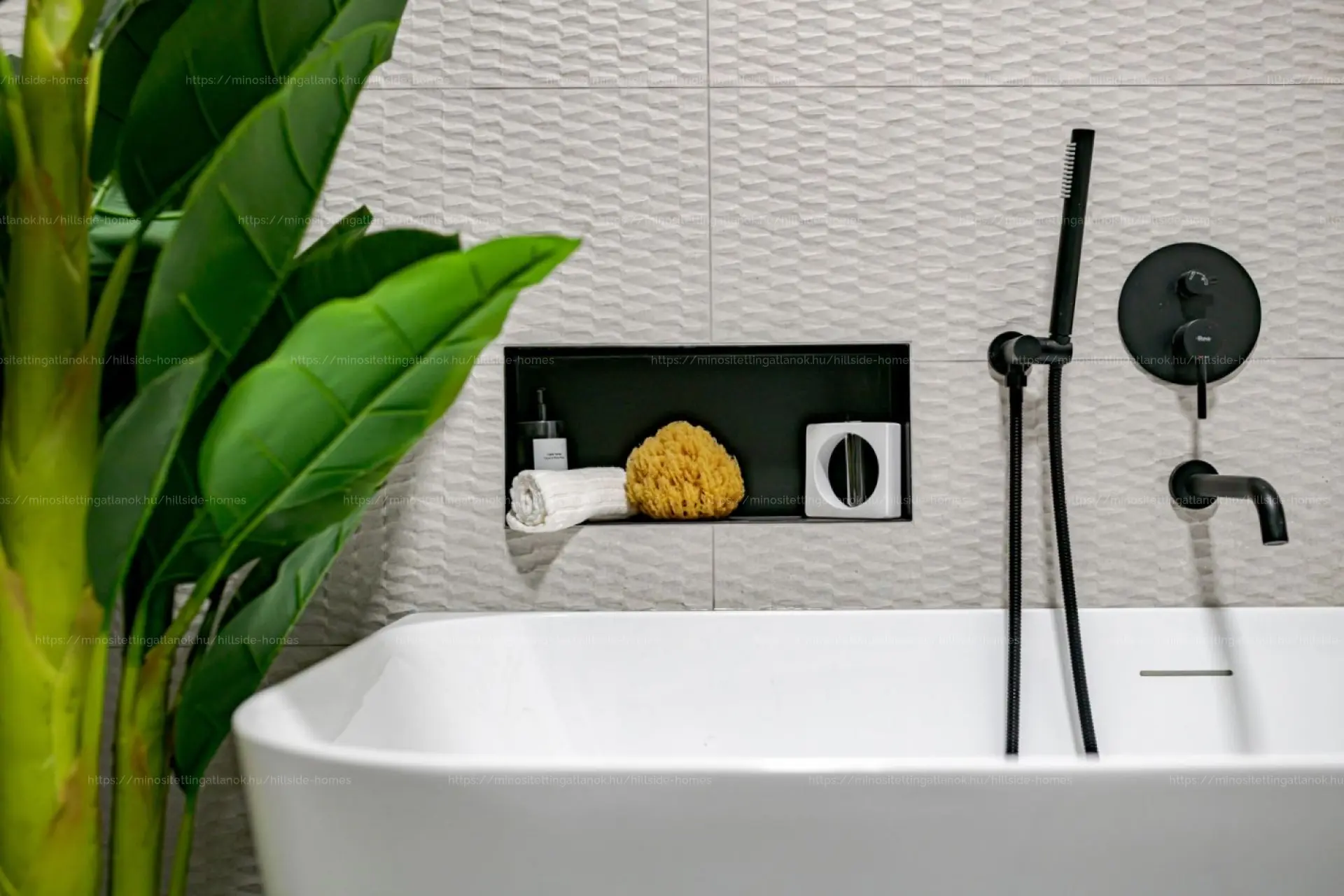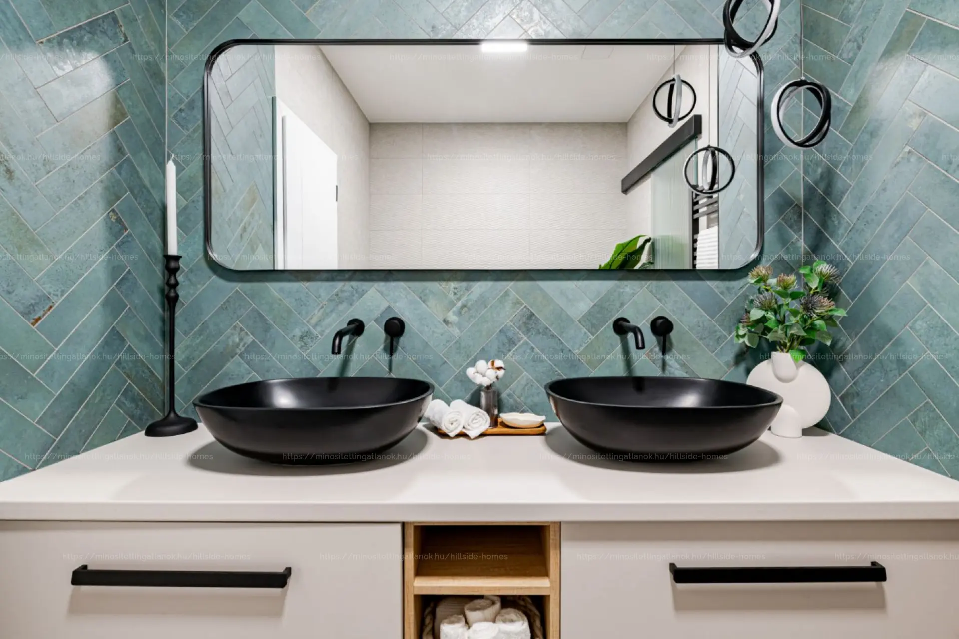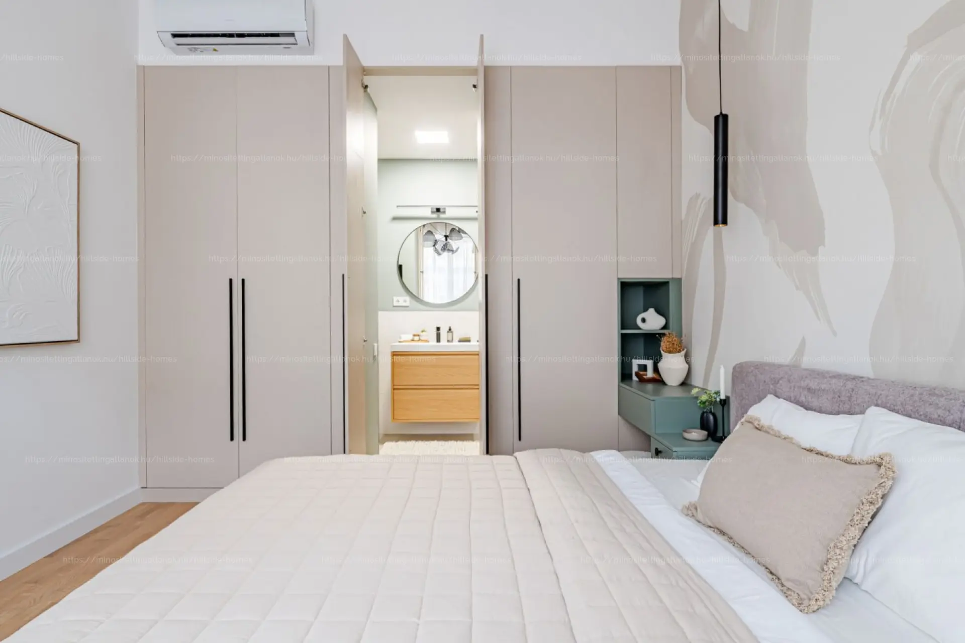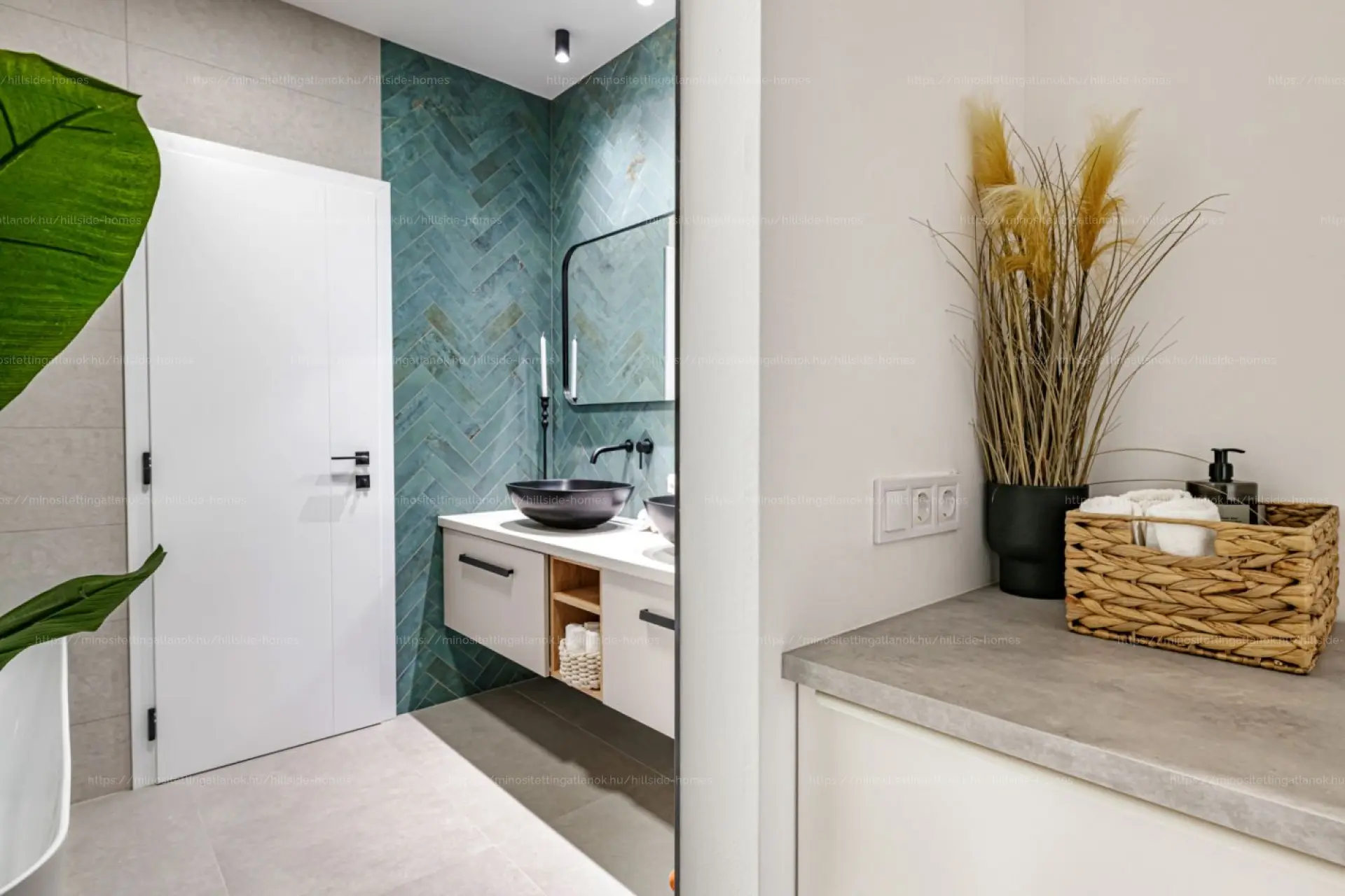 A fő hálószobához saját fürdőszoba tartozik épített zuhanyzóval és WC-vel, míg a folyosóról elérhető másik fürdőszoba káddal és dupla mosdóval felszerelt – tökéletes egy reggeli rohanásnál is. Emellett külön vendég-WC és egy praktikus mosókonyha is helyet kapott.