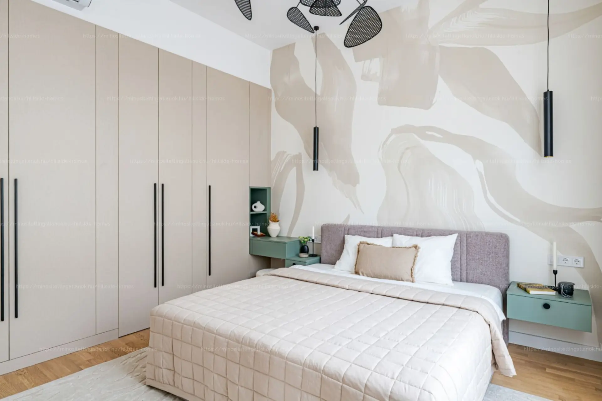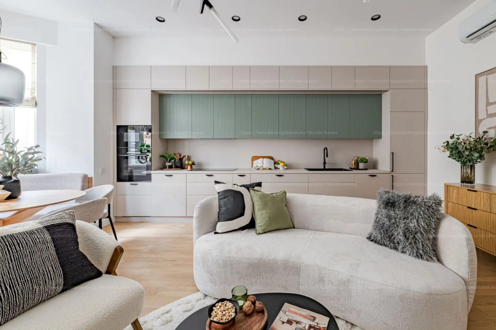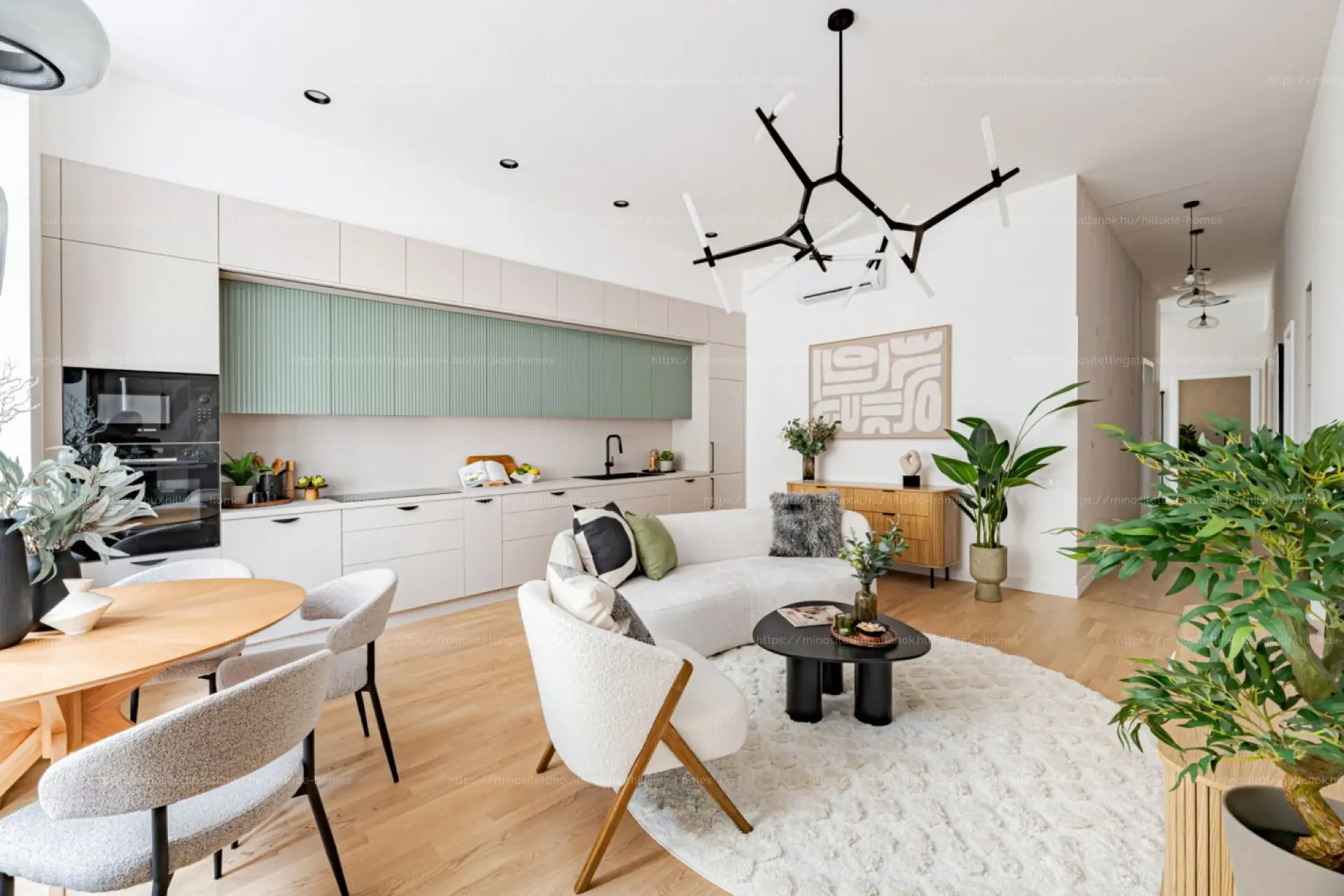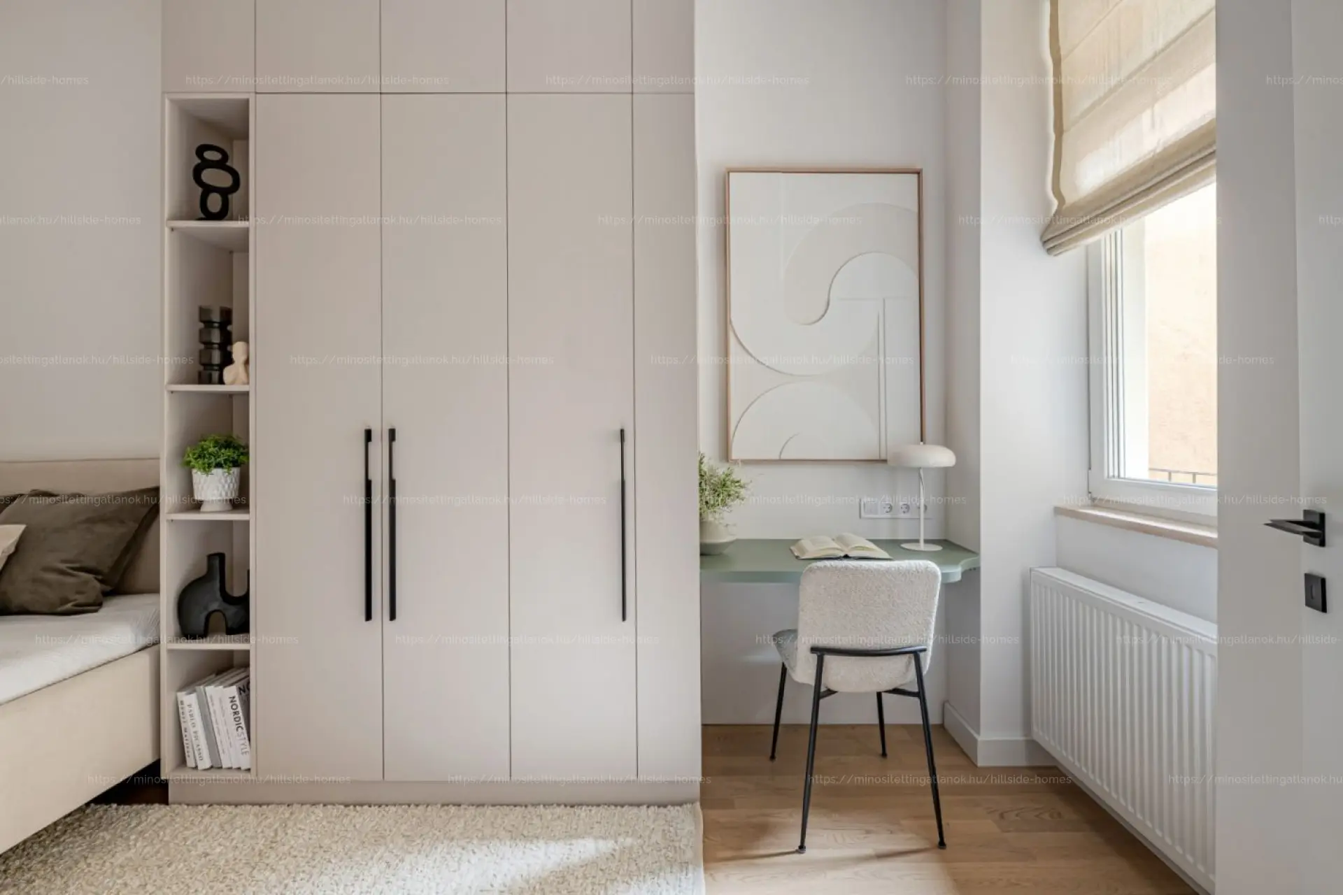 Az egész lakásban egyedi tervezésű, beépített bútorok találhatók, amelyek a vételár részét képezik, így az új tulajdonosnak csak a személyes tárgyakat kell hoznia. A konyha különösen figyelemre méltó: csúcskategóriás Bosch gépekkel felszerelt, a modern családi főzések minden igényét kiszolgálja.