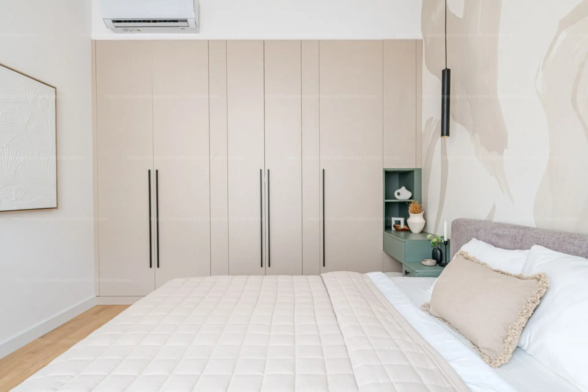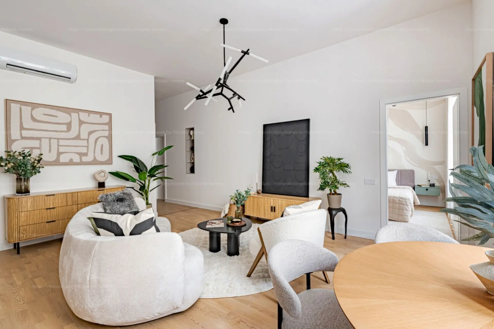A lakás minden részlete új, átgondolt és kiváló minőségű. A gépészet teljes cserén esett át: új elektromos és vízvezeték-hálózat, korszerű kondenzációs gázkazán és egy hűtő-fűtő klímás rendszer biztosítja a kényelmes és fenntartható működést. A nappalit és két hálószobát külön központi klíma hűti.