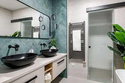 A fő hálószobához saját fürdőszoba tartozik épített zuhanyzóval és WC-vel, míg a folyosóról elérhető másik fürdőszoba káddal és dupla mosdóval felszerelt – tökéletes egy reggeli rohanásnál is. Emellett külön vendég-WC és egy praktikus mosókonyha is helyet kapott.