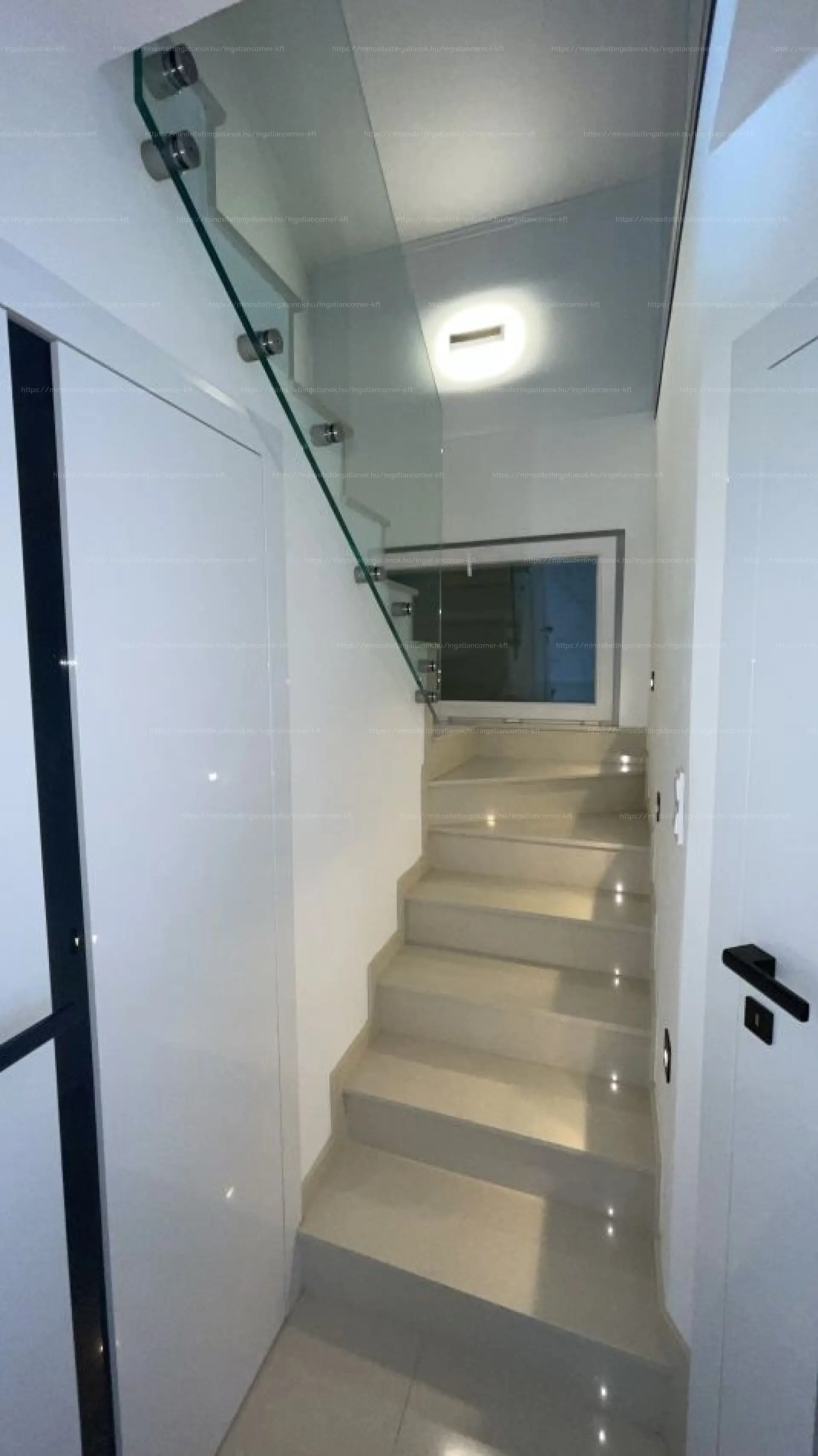 Tetőteraszos szint: tetőtéri nappali, két háló, tágas gardrób és üvegkorlátos terasz, olasz prémium burkolatfelületek, radiátoros fűtés.