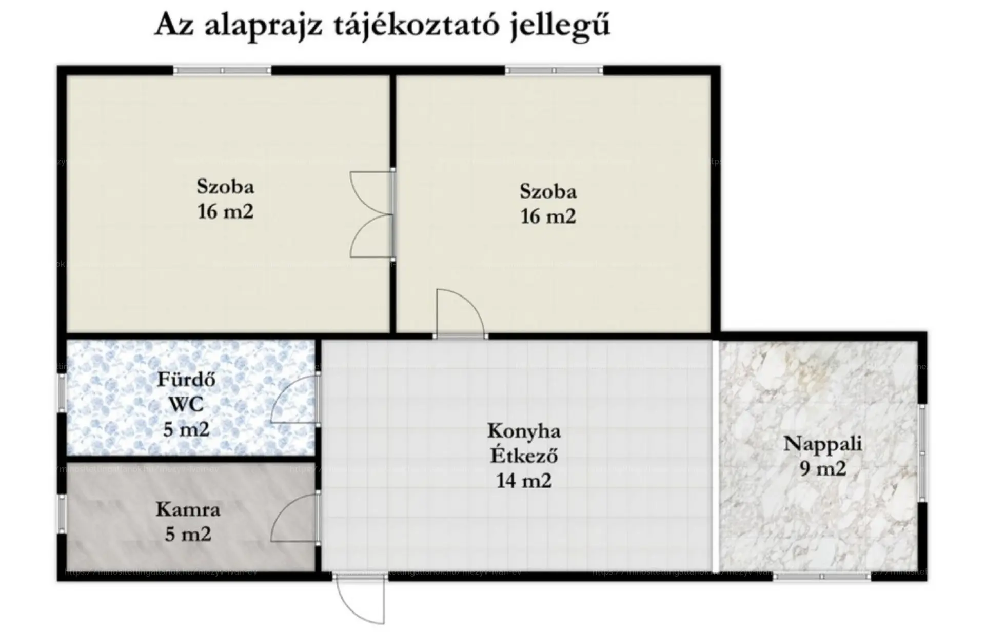A ház nappali, két hálószoba, étkező, főzőfülke és épített zuhanyzós fürdőszoba elrendezésű, minden helyiség funkcionálisan jól kihasznált.