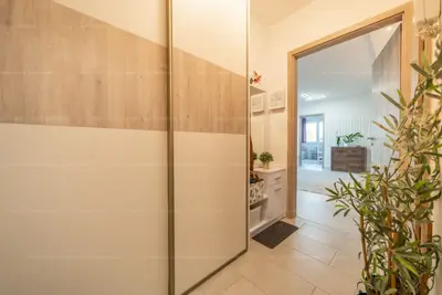 Előtér illetve konyha+étkező és a fürdő hidegburkolattal, nappali és szobák laminált parkettával vannak ellátva. Fürdőszobában épített zuhany és fürdőkád is rendelkezésre áll. Elektromos alumínium redőny és szúnyogháló található minden ablakon. A lakásban lévő 3 db beépített szekrény is az ár részét képezi.