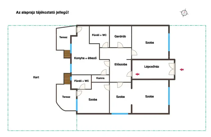 - Padló- és szobafekvések: két ÉK-i fekvésű szoba reggeli napfényre, két DK-i szoba délutáni benapozottsággal a teraszokkal