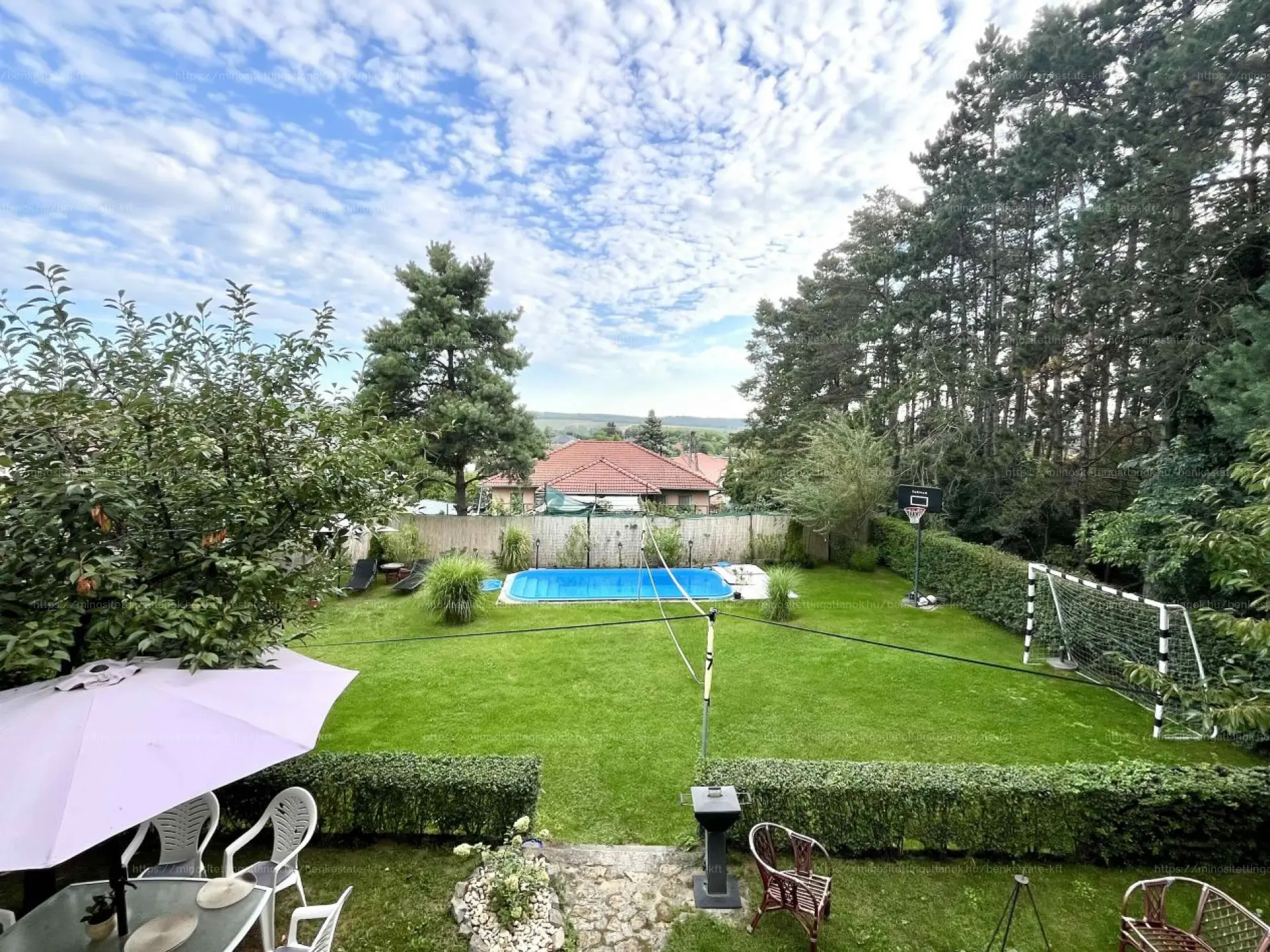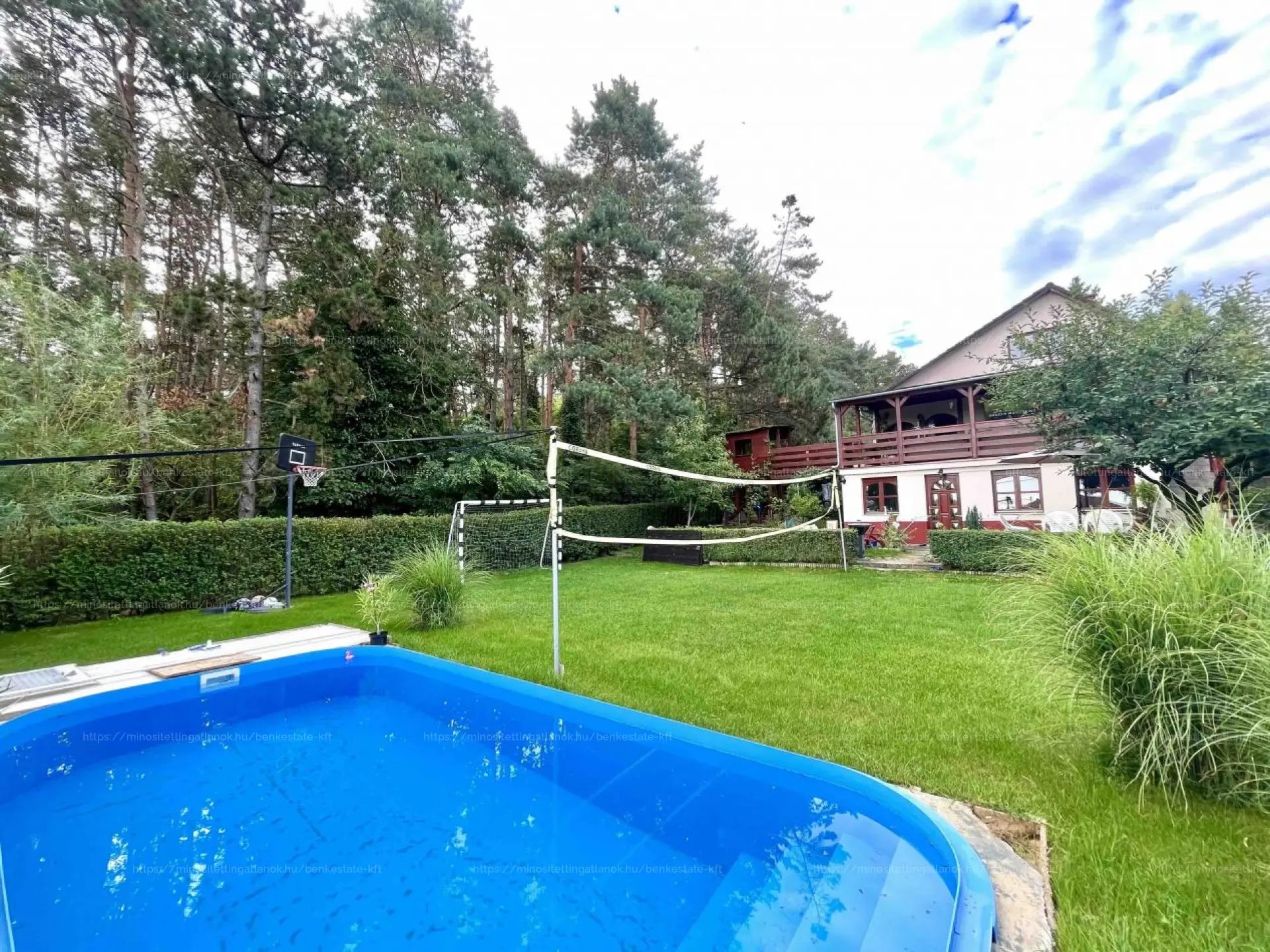 Veresegyház tőszomszédságában, Erdőkertesen csendes, átmenő forgalomtól mentes kis utcában, közvetlenül az erdő mellett, 625nm-es saroktelken helyezkedik el a netto 138,5nm-es eladó ingatlan 29nm-es teljesen fedett terasszal, 8*4m-es, 150cm mély kerti medencével, erdei fa házikóval a gyerekeknek.