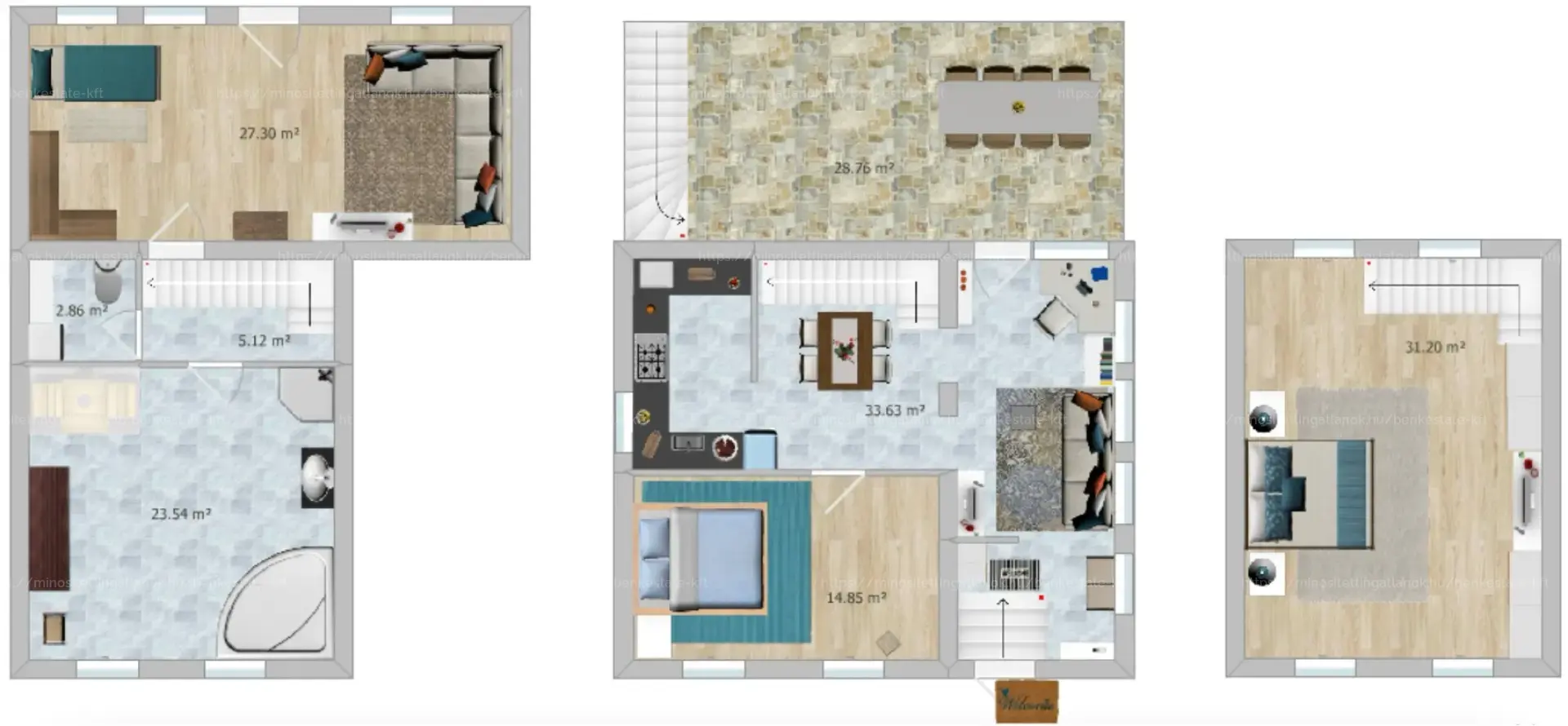 a földszinten található az előszoba, nappali, konyha, étkező, egy tágas közel 15nm-es szoba, míg az emeleten egy 31nm-es, akár két hálóvá is felosztható szoba került kialakításra.