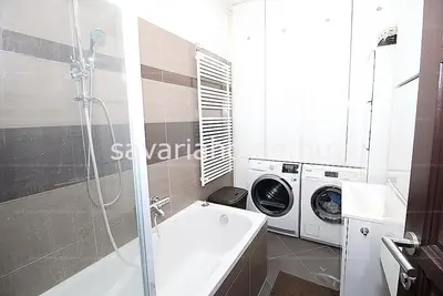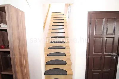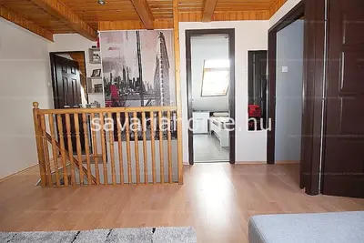 Az alsó szinten teljesen gépesített konyha, étkezővel, fürdőszoba különálló mellékhelyiséggel, tágas nappali, és egy hálószoba erkéllyel, beépített szekrénnyel, lépcső alatti plusz, tároló helyiséggel található.