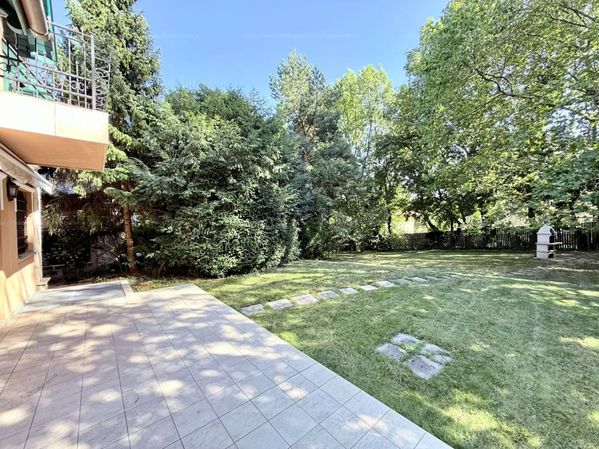 A sík, gondozott kert épített kemencéjével baráti esték tökéletes helyszíne, miközben a környék nyugalma és a közeli nemzetközi iskolák, óvodák kényelme ritka harmóniát teremt.