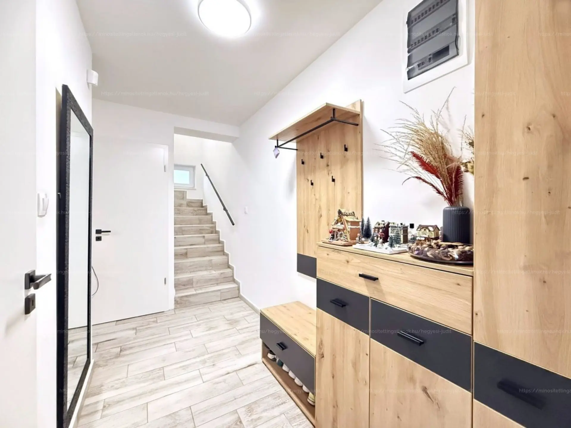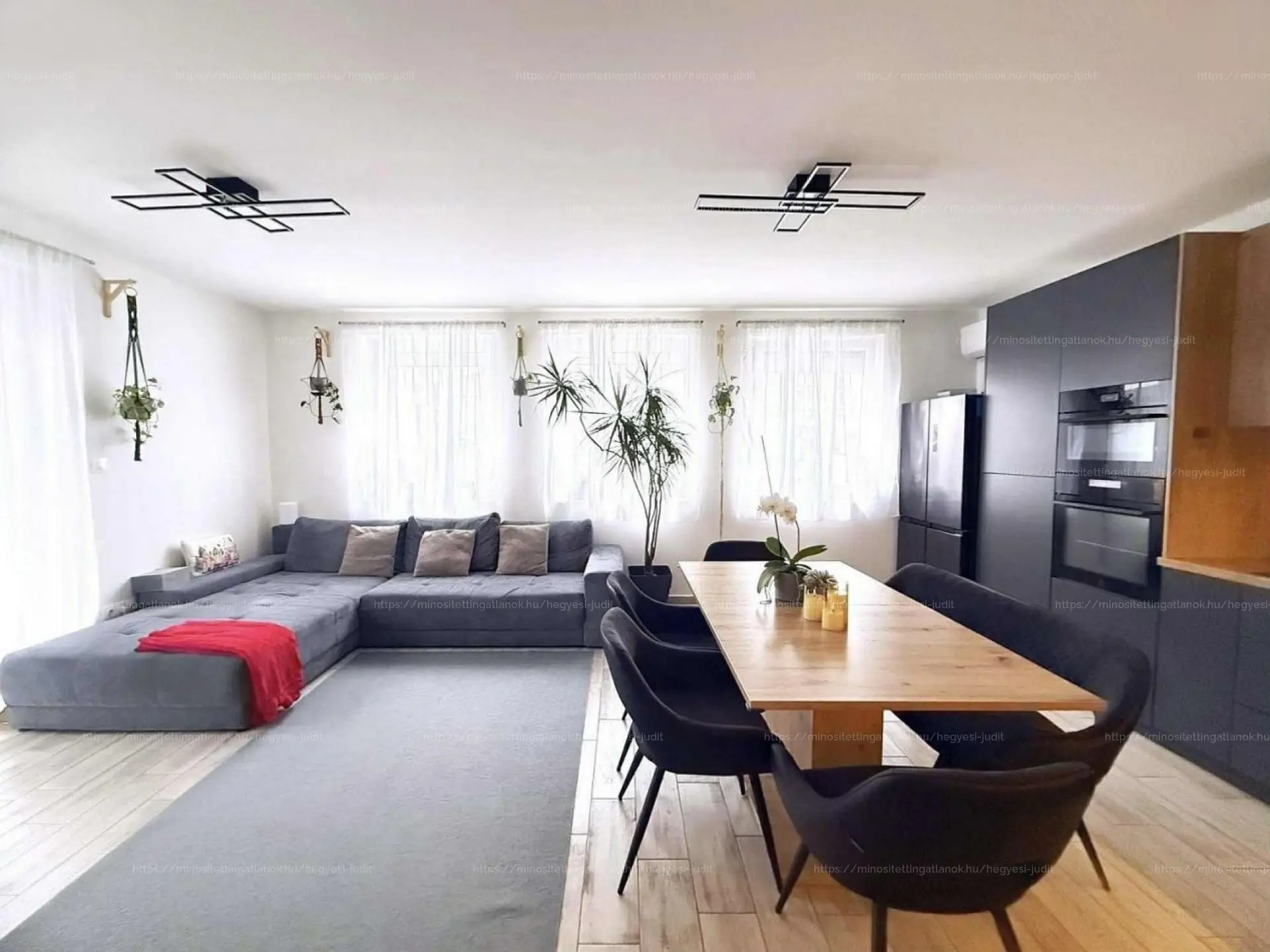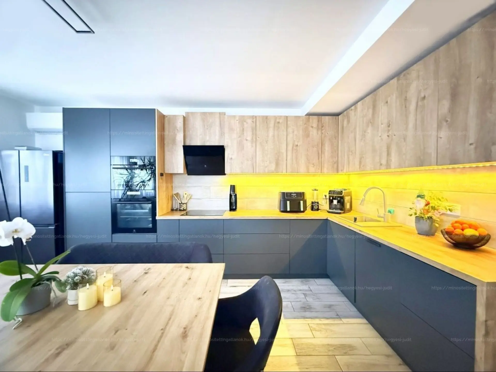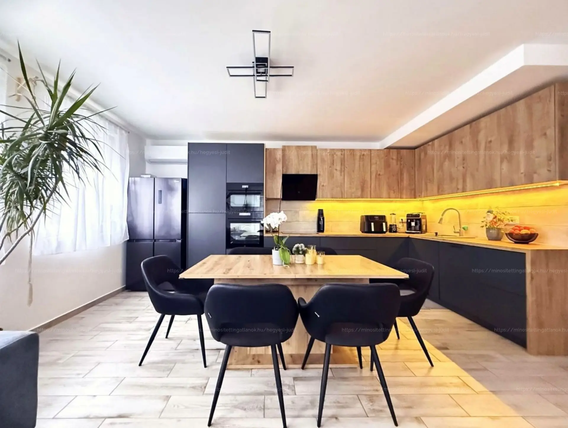 A földszinten amerikai konyhás, világos nappali–étkező található, modern, prémium gépesített konyhával (wifis Electrolux sütő, indukciós főzőlap).