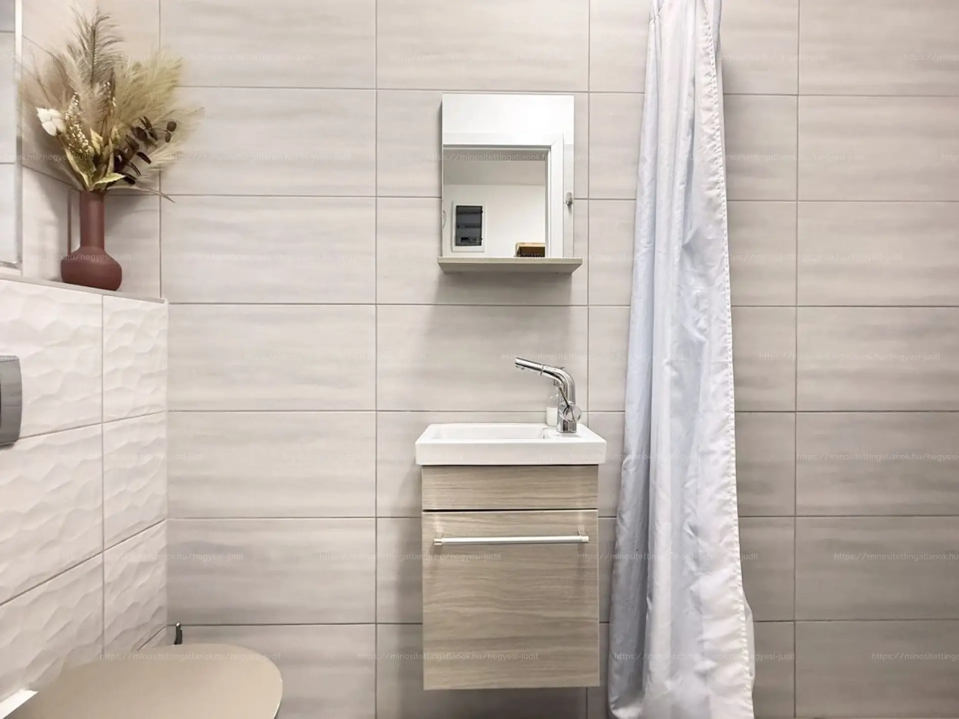 Fürdőszoba zuhanyzóval és WC-vel, külön háztartási helyiség hőszivattyúval, padlófűtés az egész lakásban.
