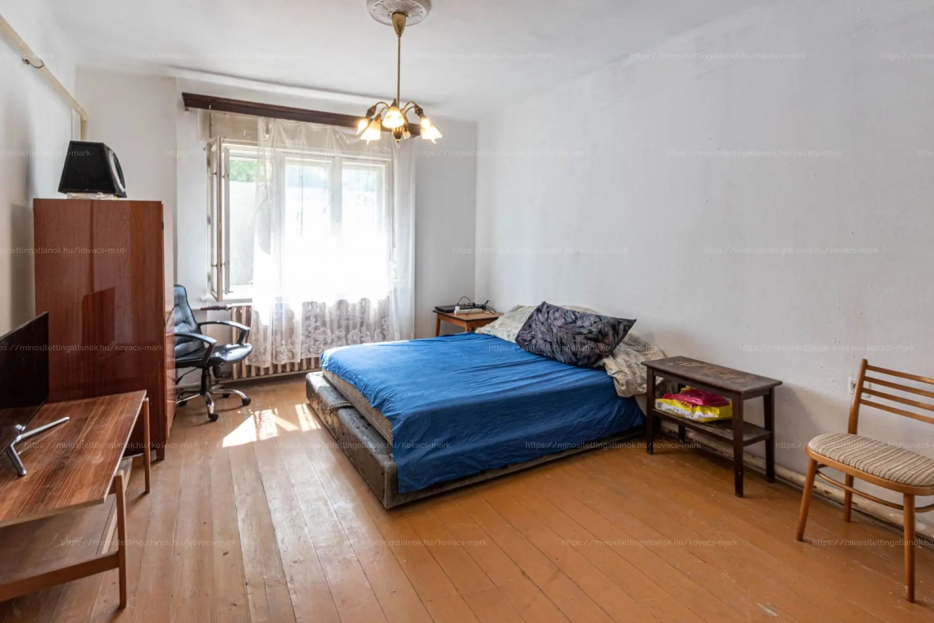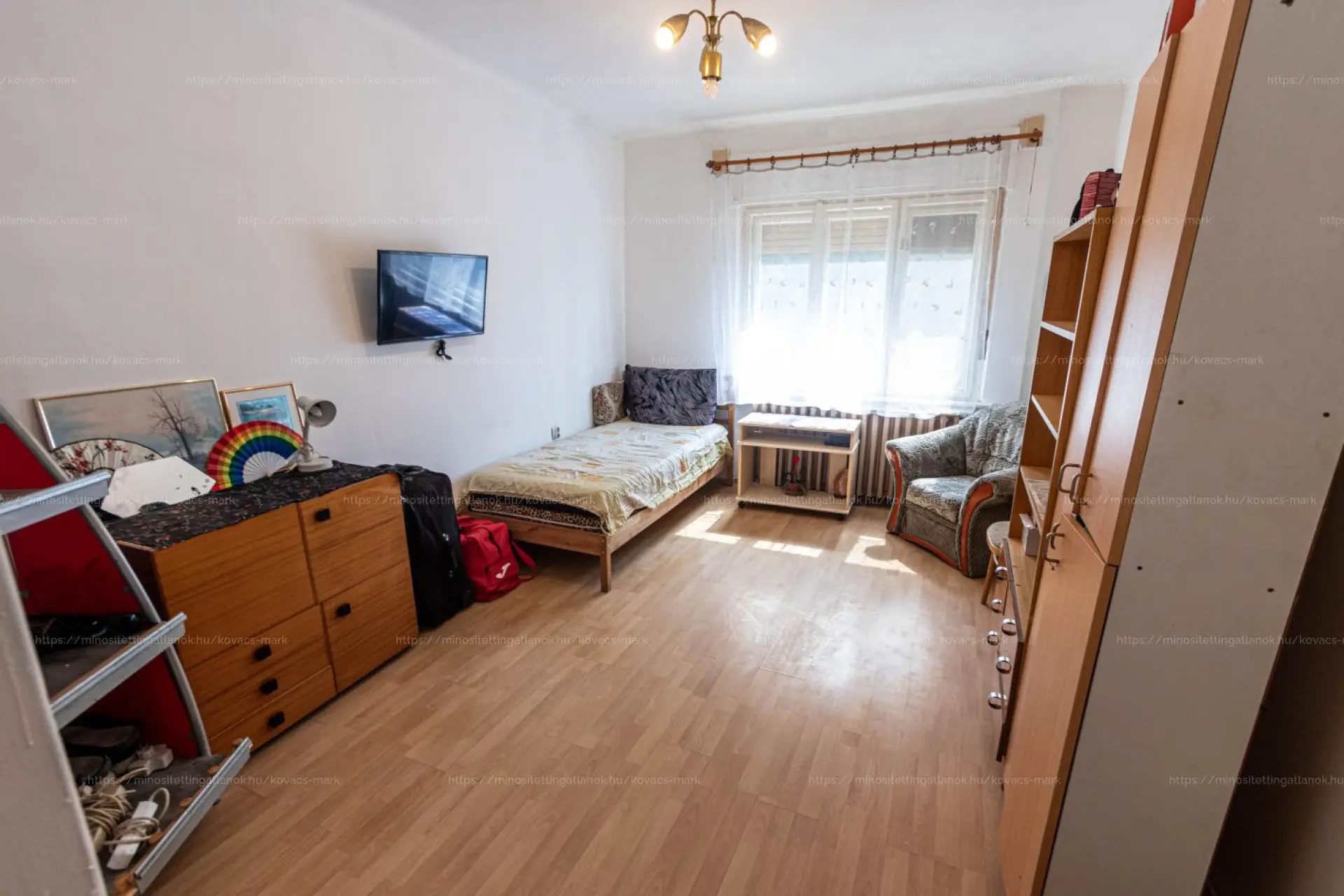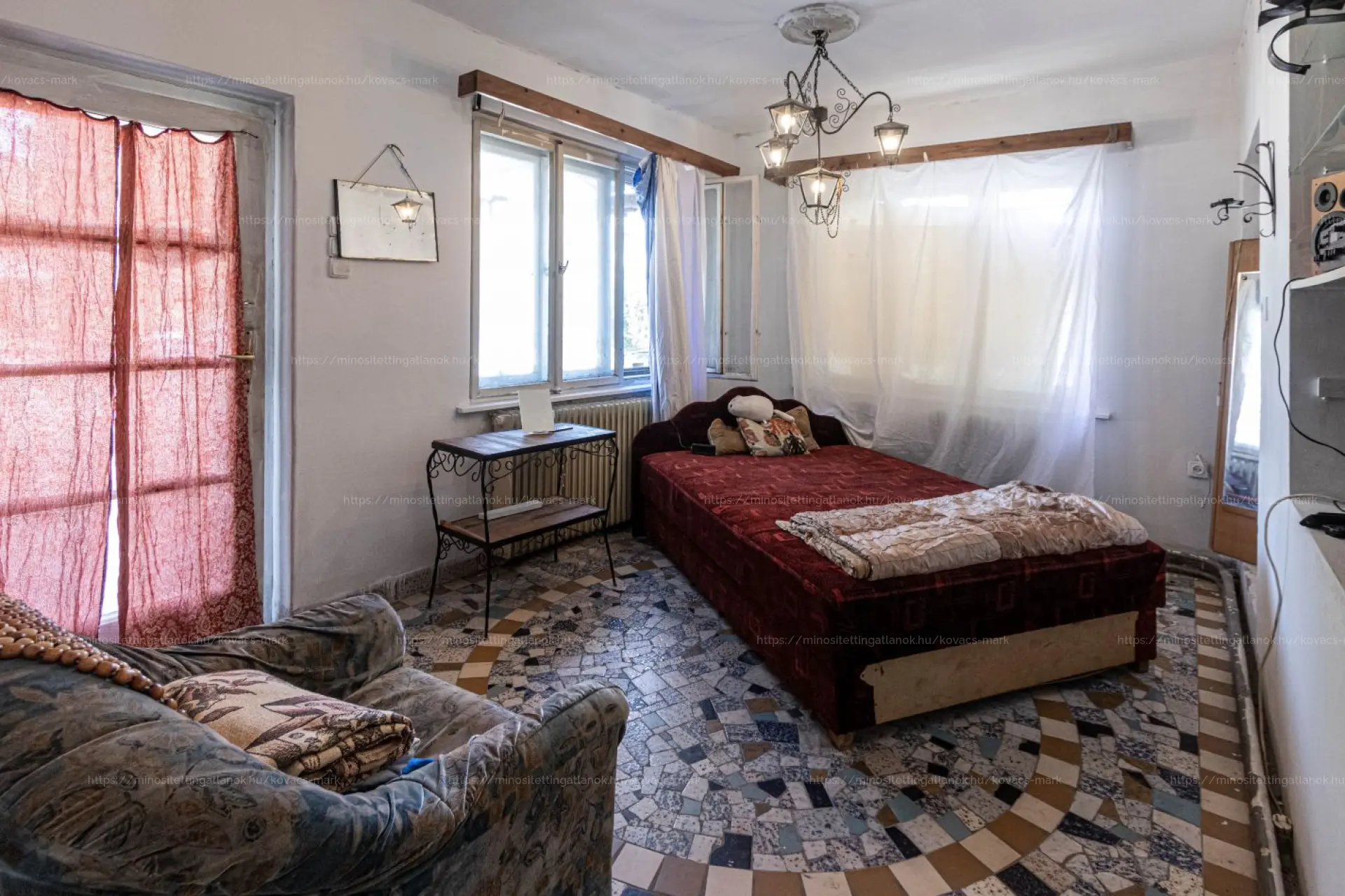 A telek közepén, oldalhatáron helyezkedik el, előkerttel, hátsó, külső lépcső a bejáratnál, előszoba, étkezős konyha, fürdőszoba wc , 4 külön szoba,kamra.