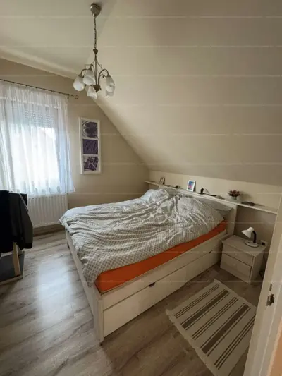 A ház alsó szintjén egy hangulatos veranda fogadja Önt, ahonnan a szélfogón keresztül beléphet a tágas nappaliba. A hideg téli estéken a meghitt melegséget a cserépkályha biztosítja. A földszinten található még egy praktikus gardrób, egy WC, valamint egy modern konyha étkezővel, ahol a család összegyűlhet a finom vacsorák mellé.