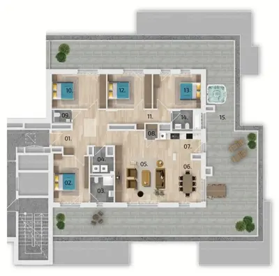 A szülői háló a saját fürdőszobával jól elkülönül a lakáson belül. A további 3 szobához még egy fürdőszoba tartozik. A komforthoz még egy mosdó, egy konyhai kamra és egy külön háztartási helyiség is tartozik.
