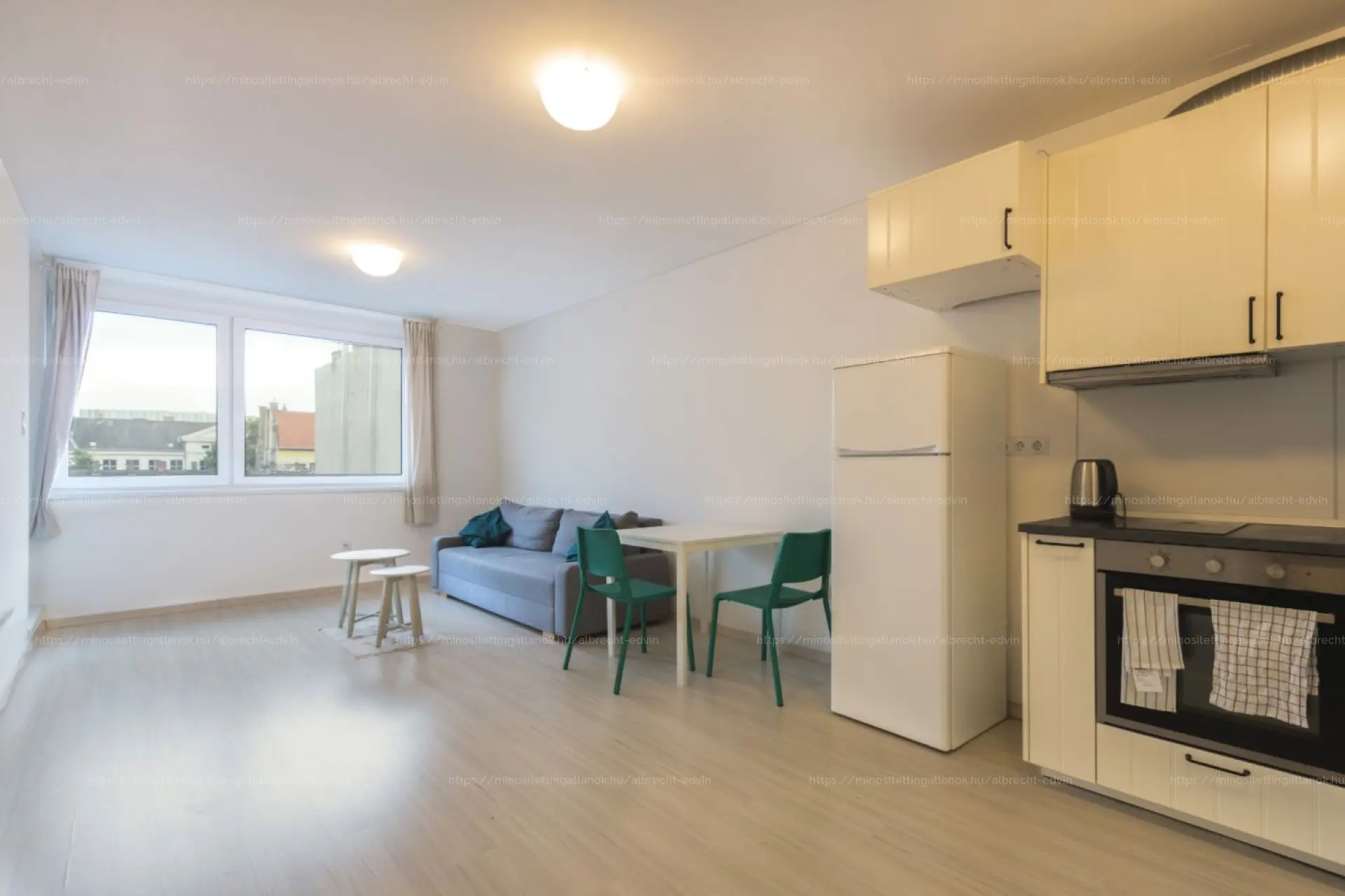 A lakás amerikai konyhás nappaliból, hálószobából, fürdőszobából WC-vel, valamint külön WC-ből áll. A szobák déli fekvésűek, világosak, a nappaliból egy hangulatos loggia nyílik.