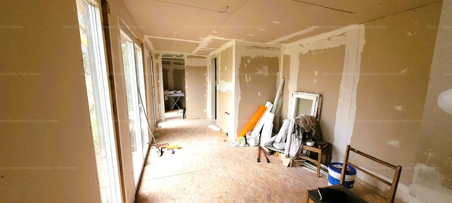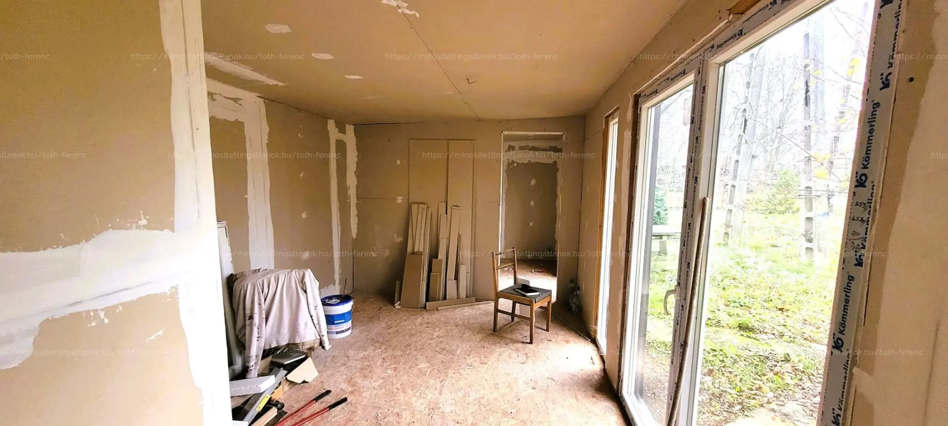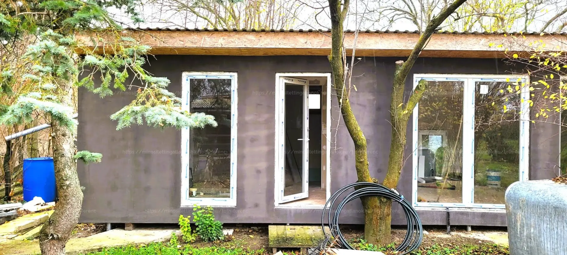 - valamint egy ÚJ, 31,6 m2-es KÖNNYŰSZERKEZETES épület, amelynek belső tere BEFEJEZÉSRE VÁR (burkolás, festés, fürdőszobai szaniterek beszerelése szükséges).
