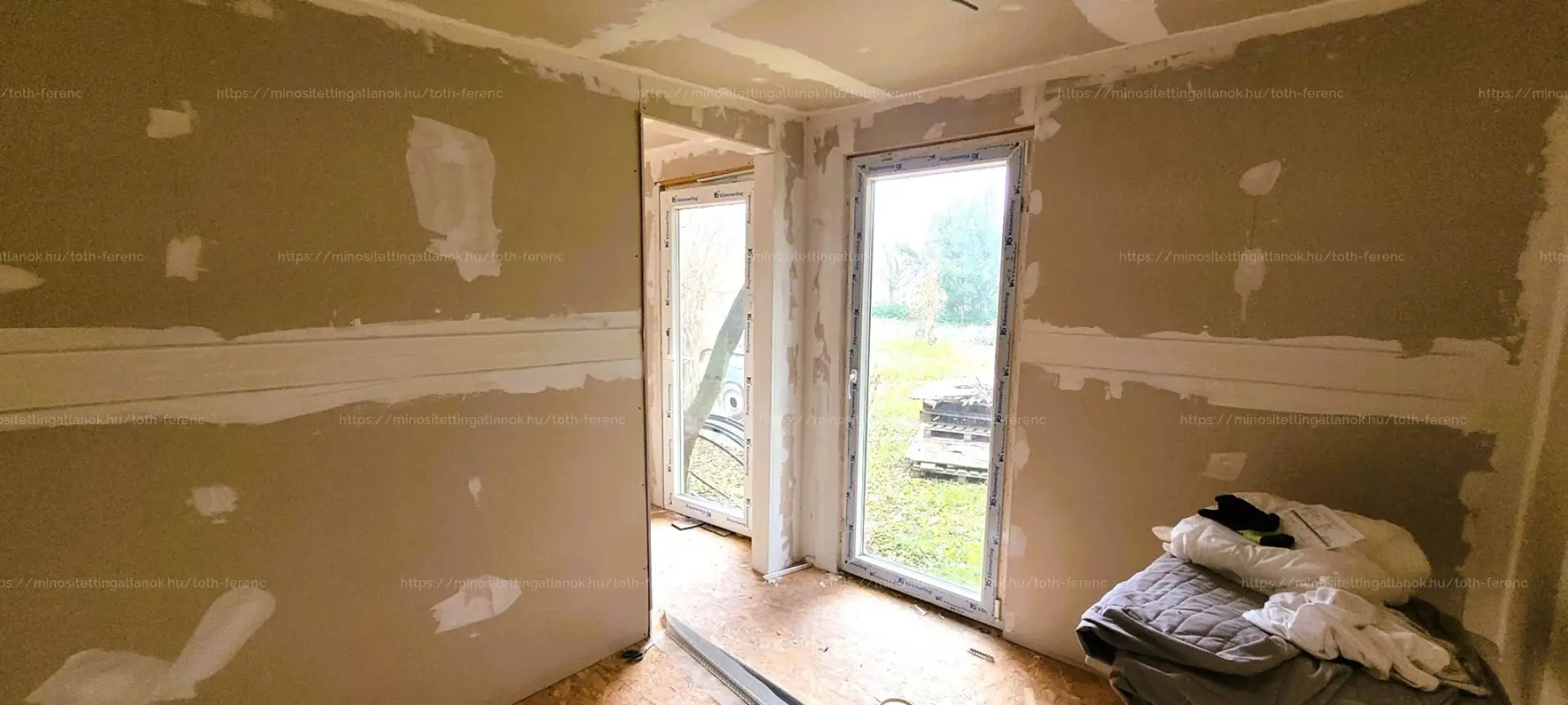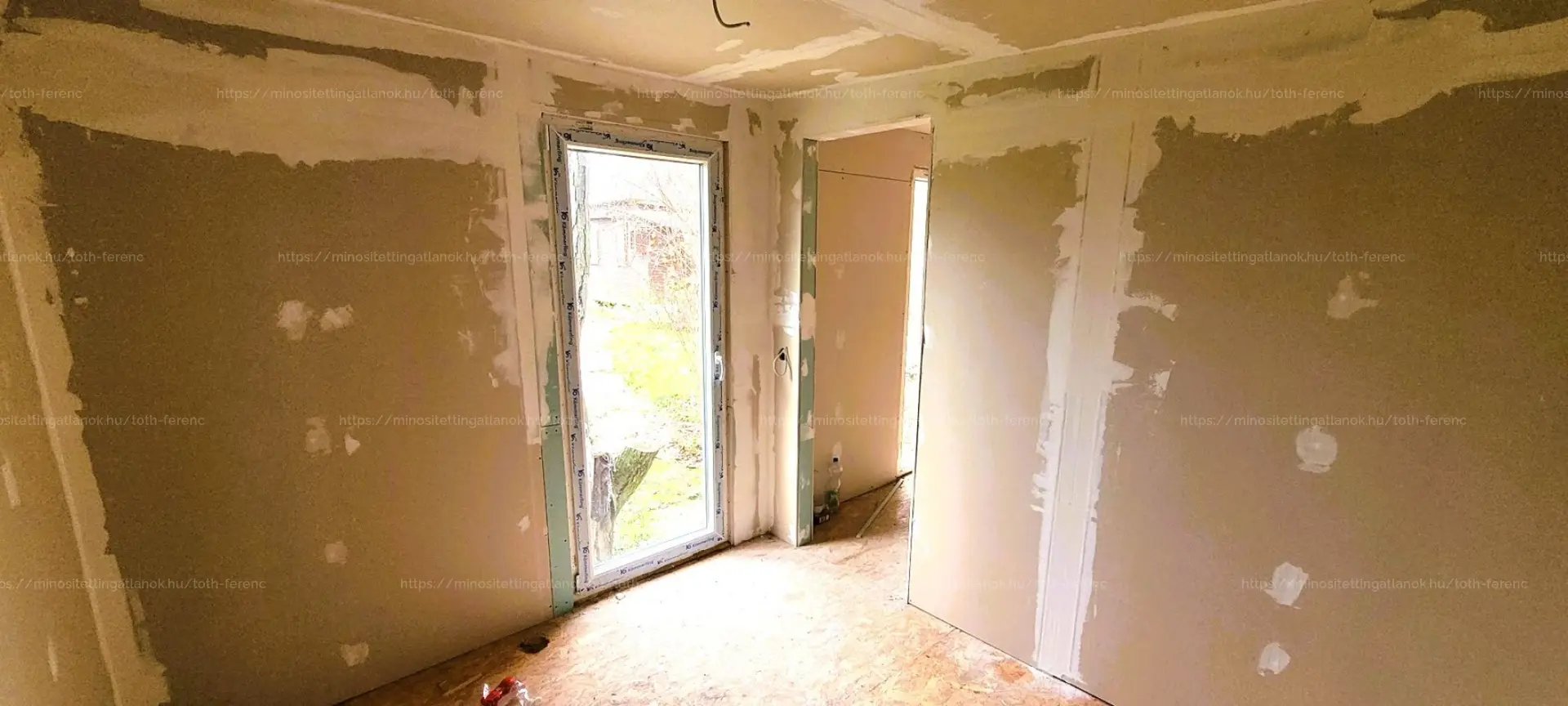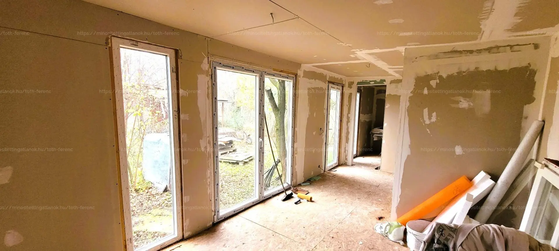 - valamint egy ÚJ, 31,6 m2-es KÖNNYŰSZERKEZETES épület, amelynek belső tere BEFEJEZÉSRE VÁR (burkolás, festés, fürdőszobai szaniterek beszerelése szükséges).