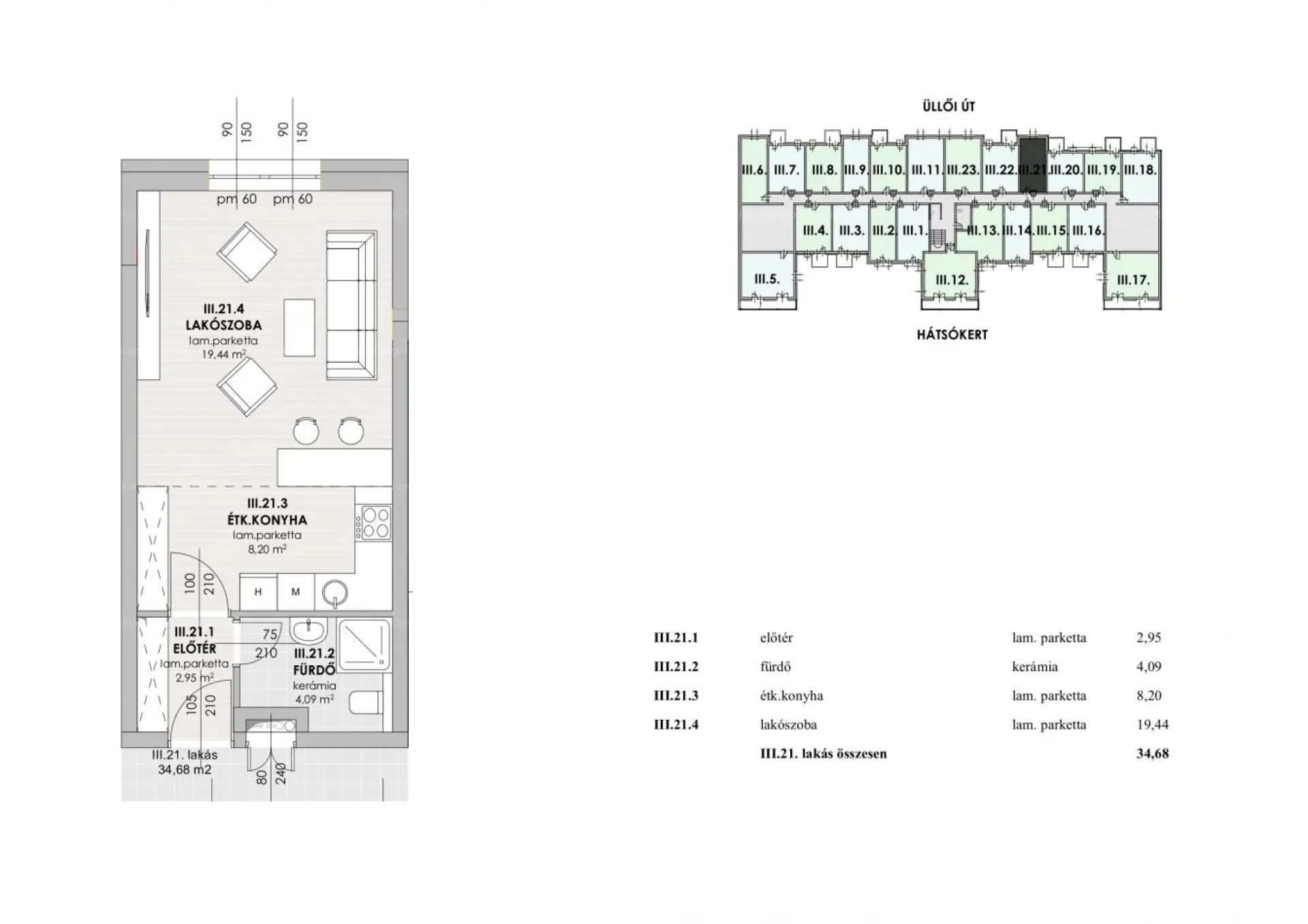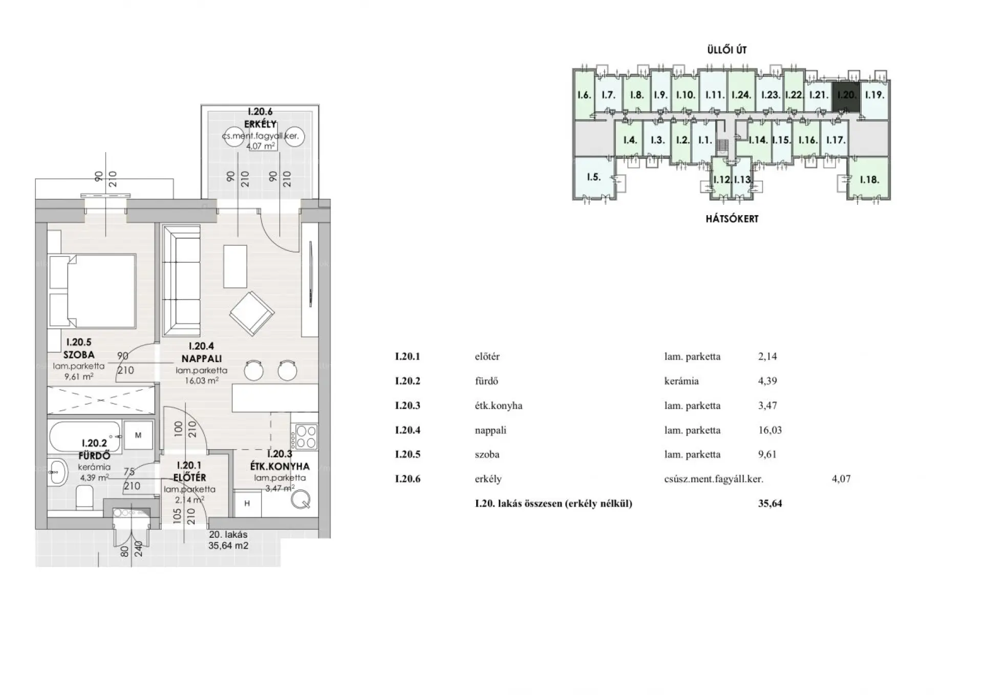 35 m2: előtér, étkező-konyha, szoba, fürdőszoba, erkély nélkül