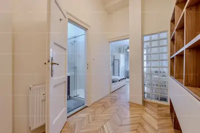 A 2016-ban igényesen megújított lakás megőrizte klasszikus báját: eredeti faparketta, nagy fakeretezésű ablakok, 3,35 m-es belmagasság, világos, tágas érzet.