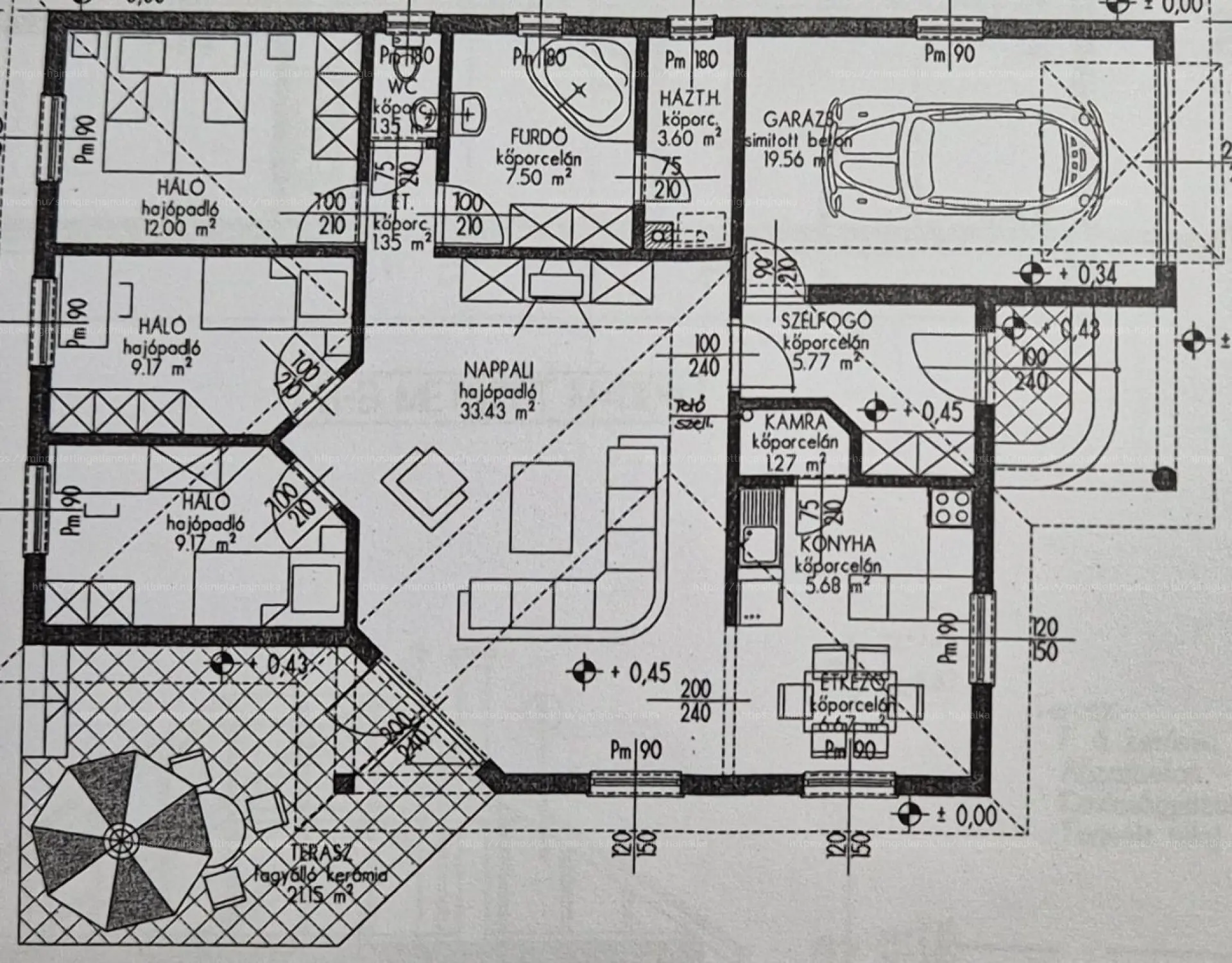 Eladó Kecskemét Budai hegyben 137 nm-es családi ház, parkosított 3422 nm telken, garázzsal, plussz két autónak fedett kocsibeállóval. A lakótér 97 nm, garázs 20 nm és a terasz 21 nm.