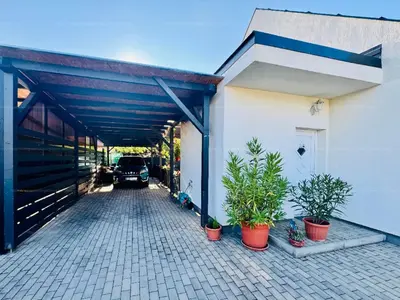 Fedett, térkövezett beálló 2 autónak, plusz kb. 15 m²-es garázs (jelenleg tároló).