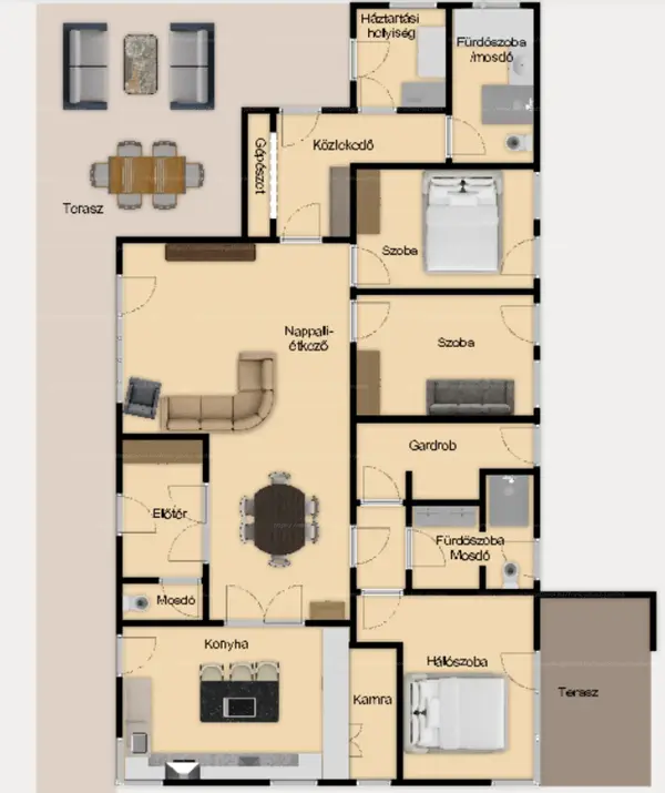 Lakóház: 150 m² hasznos alapterület + 30 m2 terasz