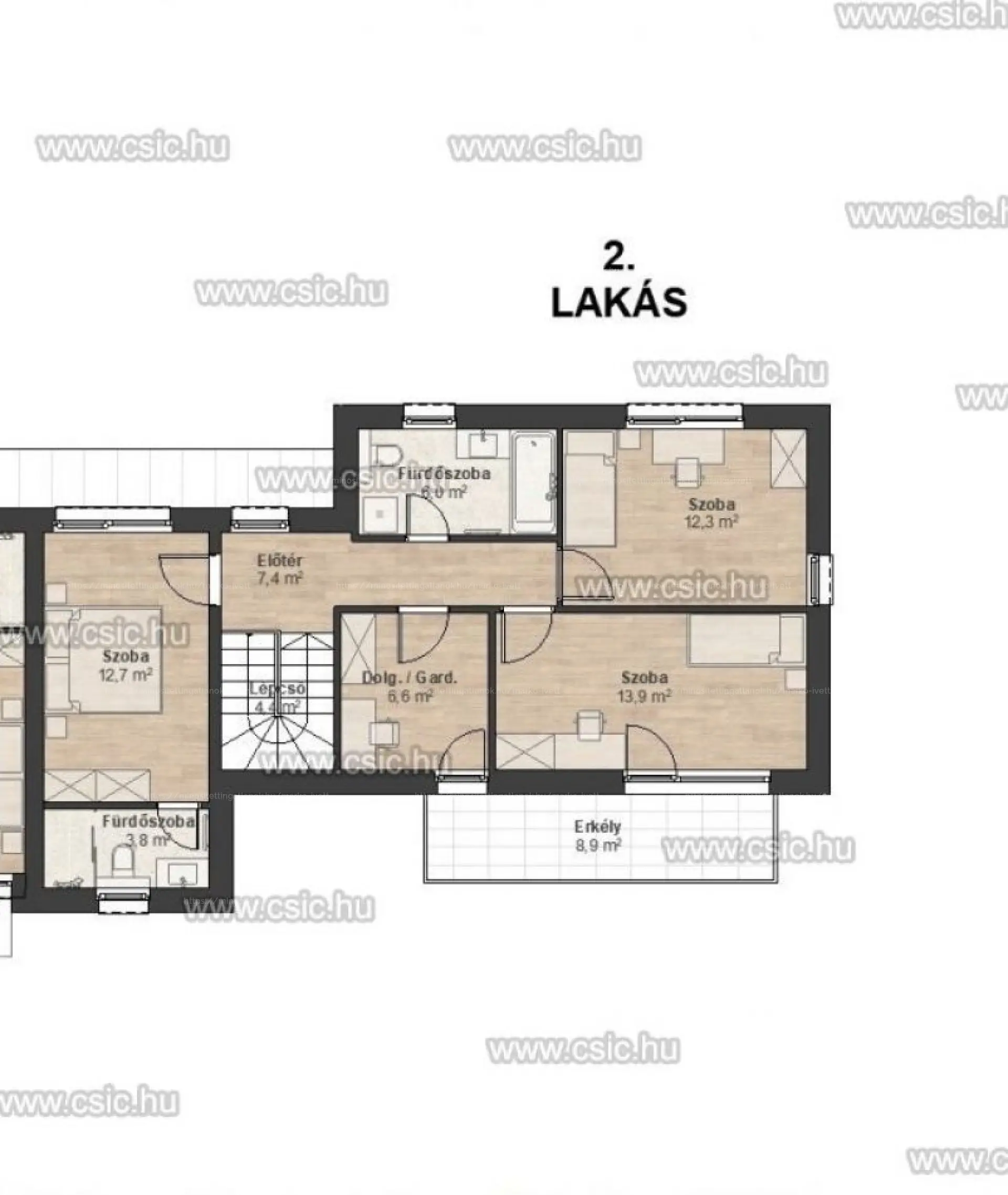 - az emeleten 3 HÁLÓSZOBA (12, 13, 14 nm), Gardrób-DOLGOZÓSZOBA (6,6 nm), előtér, lépcső és 2 FÜRDŐSZOBA (4 és 6 nm) található.