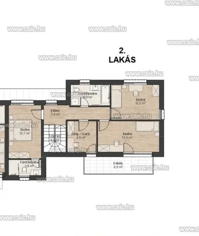 - az emeleten 3 HÁLÓSZOBA (12, 13, 14 nm), Gardrób-DOLGOZÓSZOBA (6,6 nm), előtér, lépcső és 2 FÜRDŐSZOBA (4 és 6 nm) található.