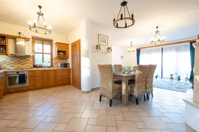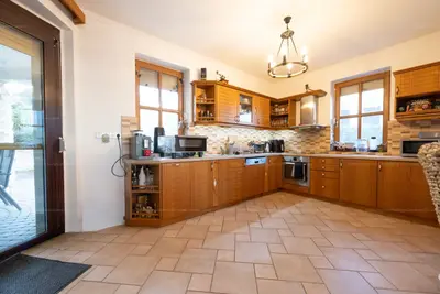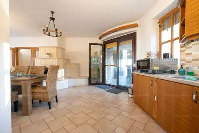 - egy légtérben kialakított amerikai konyhás nappali-étkező, modern cserépkályhával, közvetlen kijárat a fedett teraszra
