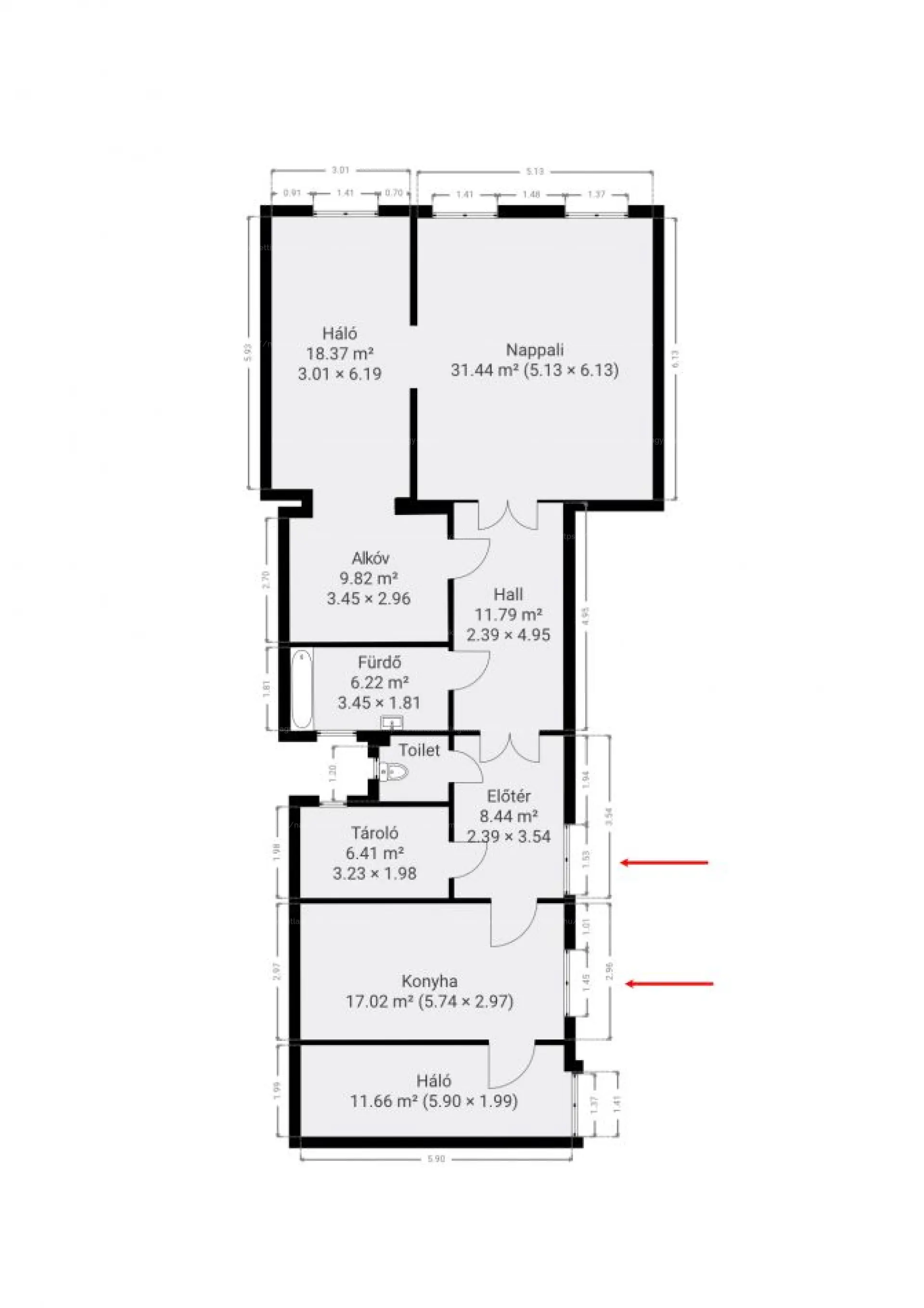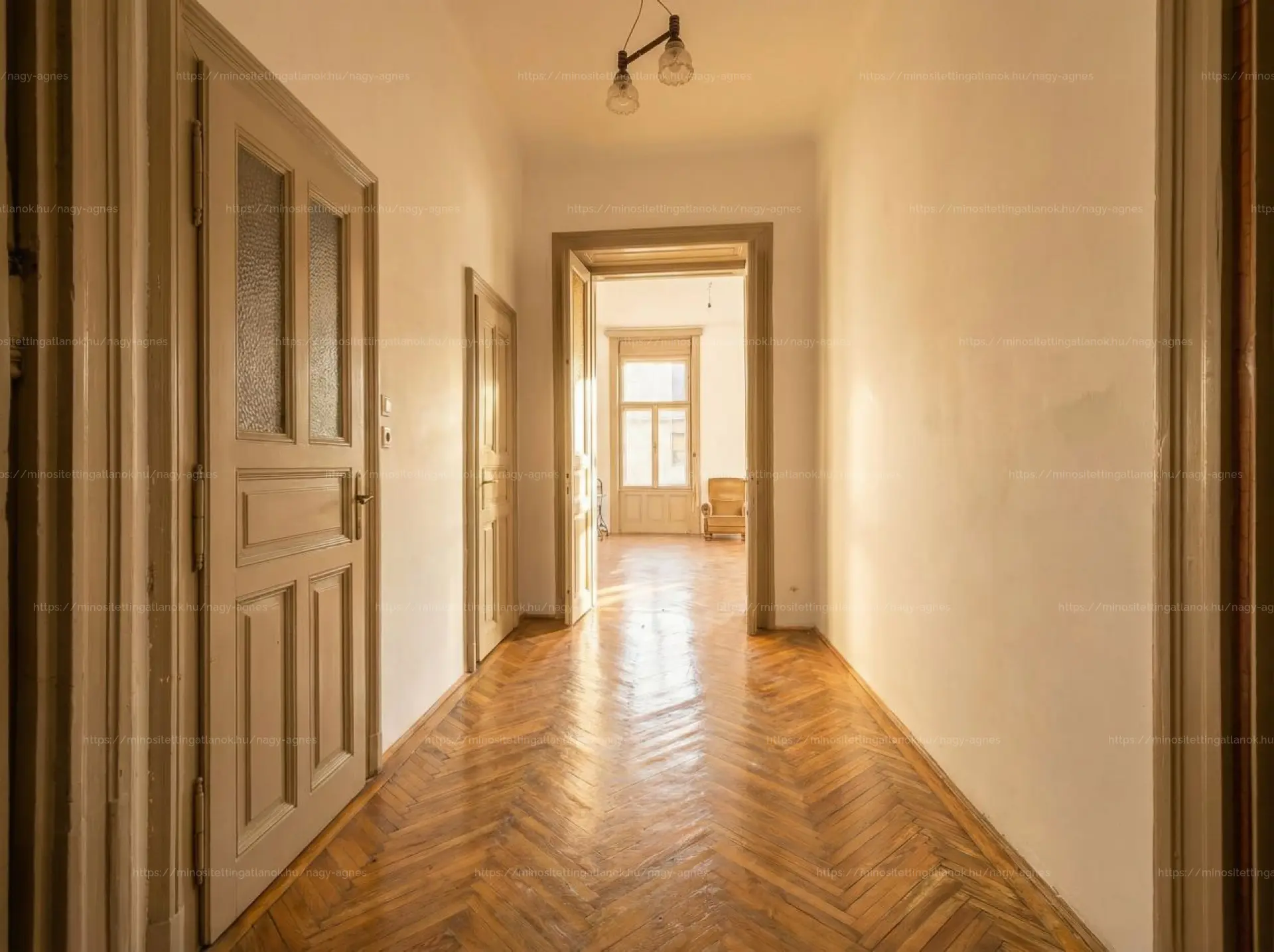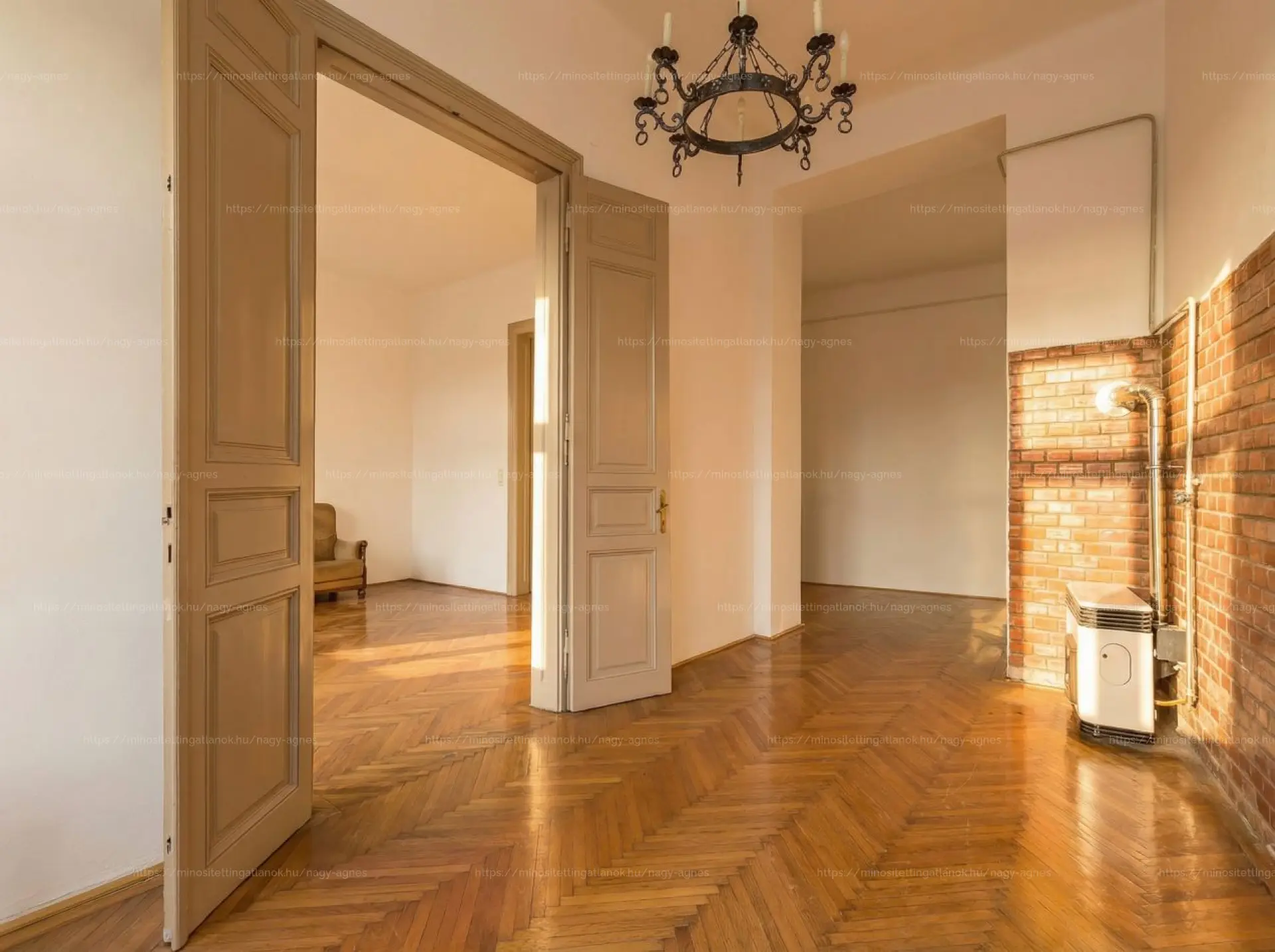 A 3. emeleten található ingatlan jól átgondolt és praktikus elosztást nyújt. A fő ajtón belépve jobbra, a hallon és a közlekedőn átjutva érkezünk a nappaliba, ahonnan nyílik egy hálószoba alkóvval; ezek a helyiségek egybenyithatóak, ami lenyűgöző, nagypolgári tereket eredményez. A közlekedőből közelíthető meg a fürdőszoba káddal, egy tároló, valamint egy külön WC. A bejárattól balra kapott helyet a konyha és egy további háló; a második bejárati ajtó a konyhából nyílik, amely külön használati lehetőségeket is támogat.