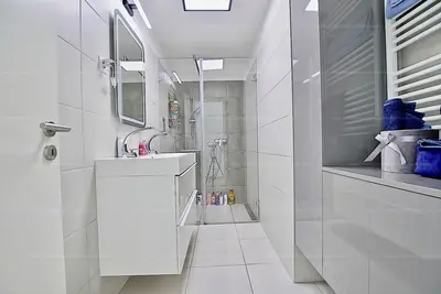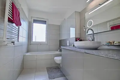 Két teljes értékű fürdőszoba és egy külön vendég WC is kialakításra került, ill., egy gardrób szoba is található a lakásban.
