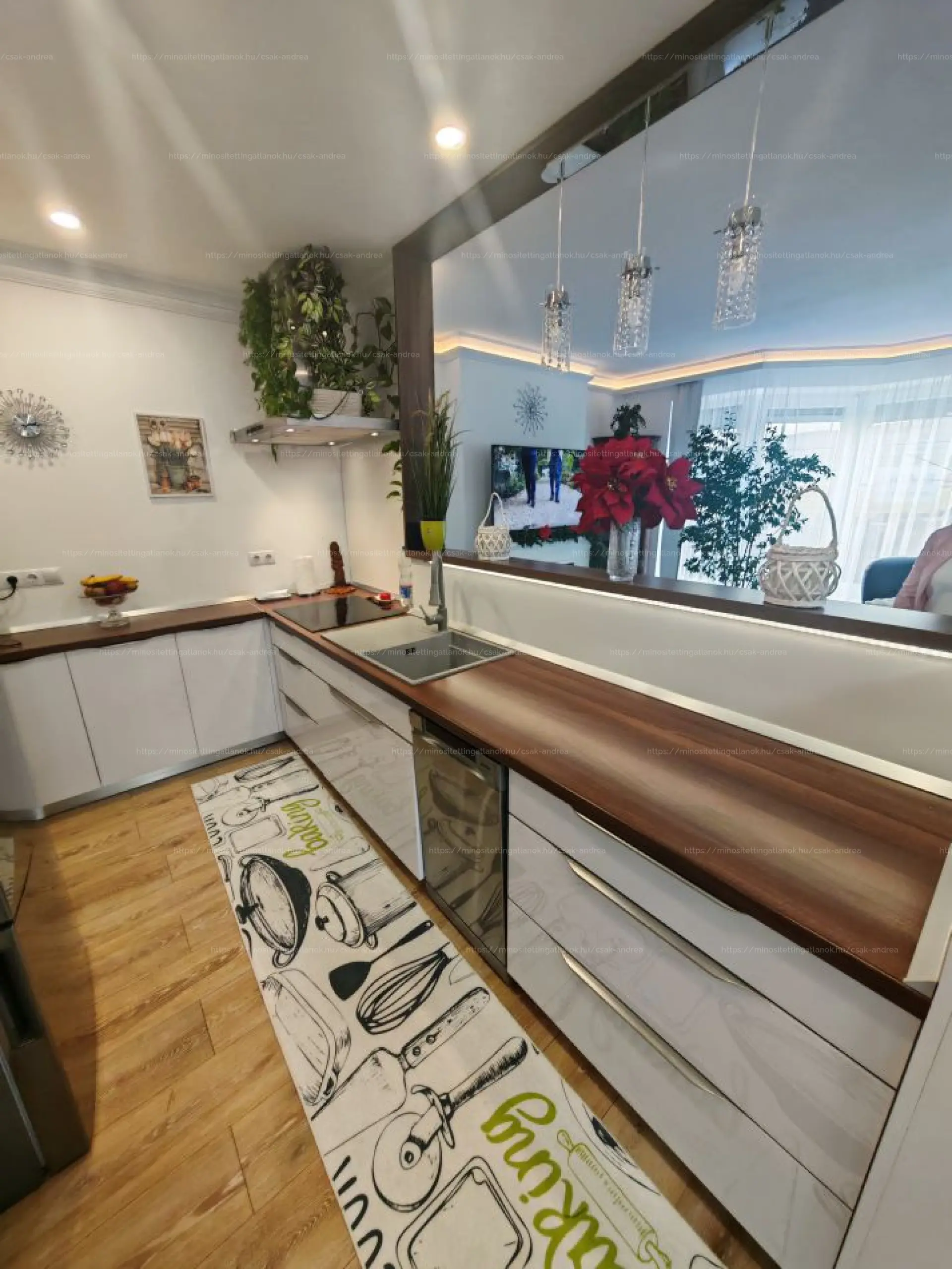 A házban műanyag nyílászárók, redőnyökkel és rovarhálóval felszerelve; a burkolatok laminált lap és kerámia kombinációja. A modern, magasfényű, egyedileg gyártott konyhabútor a ház egyik ékköve.