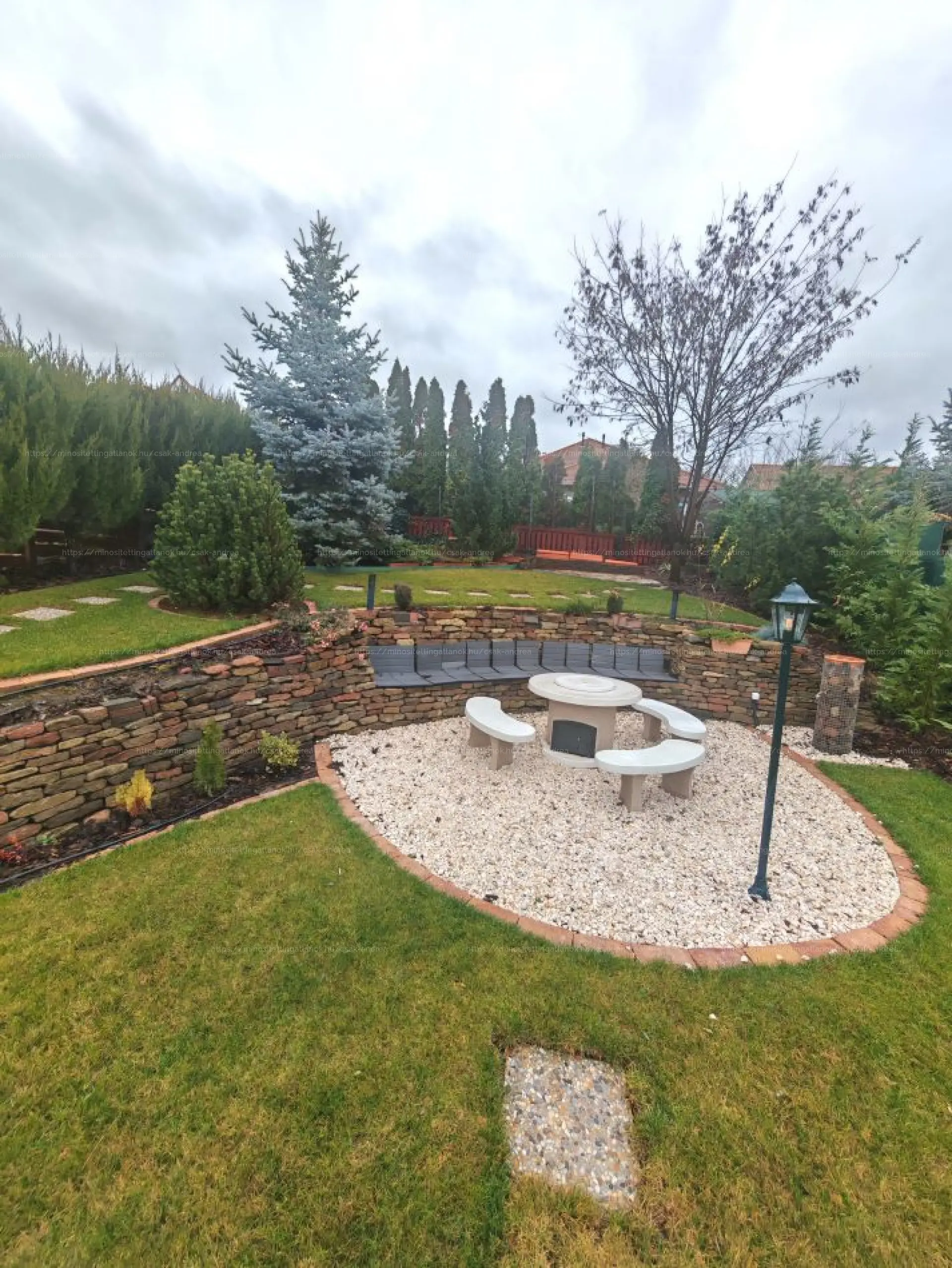 Panoráma, nyugalom, gyönyörű szomszédság, rendezett utca. A telken öntözőrendszer, gyep szőnyeg, hangulatos világítás, fedett bográcsozó hely ülőkékkel, csobogó rendszer, valamint különleges növények: pálmafa, gránátalma, selyemakác.