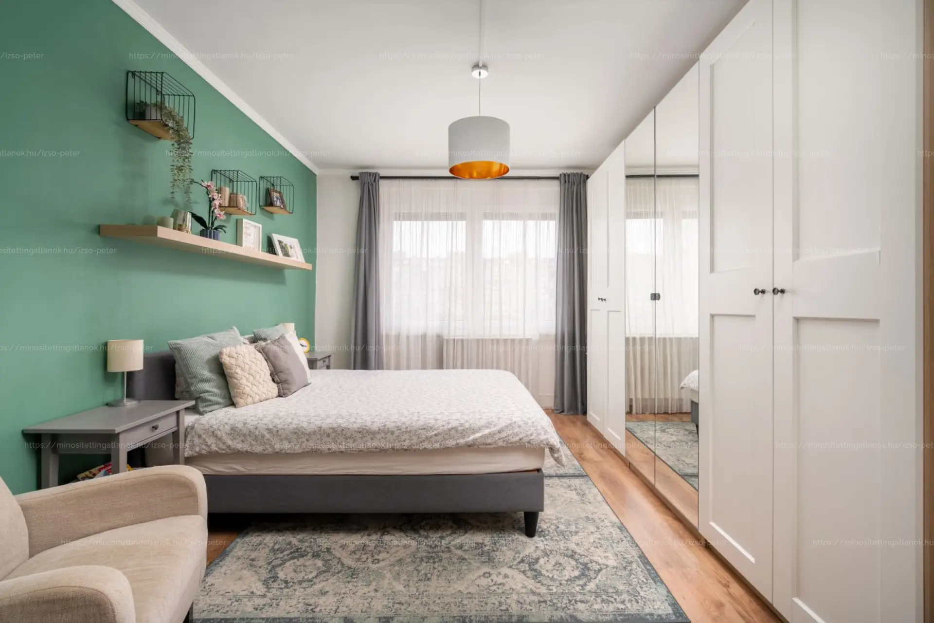 A lakás kifejezetten világos, ablakai utcára illetve zöld parkra néznek. A hőszigetelt műanyag nyílászárók redőnnyel és szúnyoghálóval felszereltek.