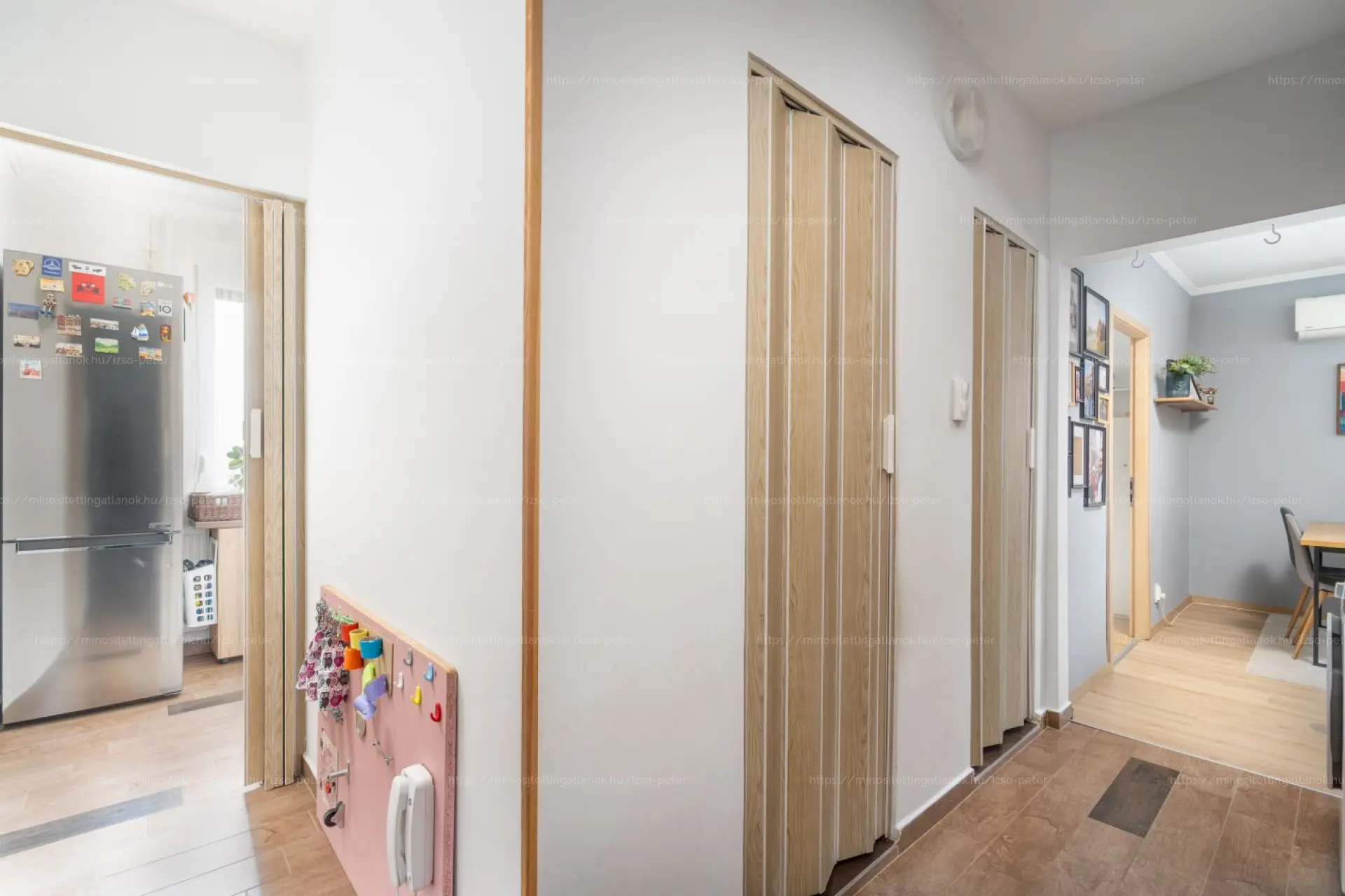 A közlekedőben található beépített szekrény praktikus tárolást biztosít.