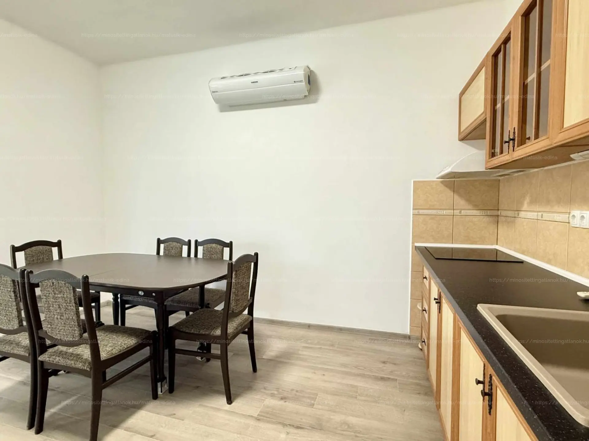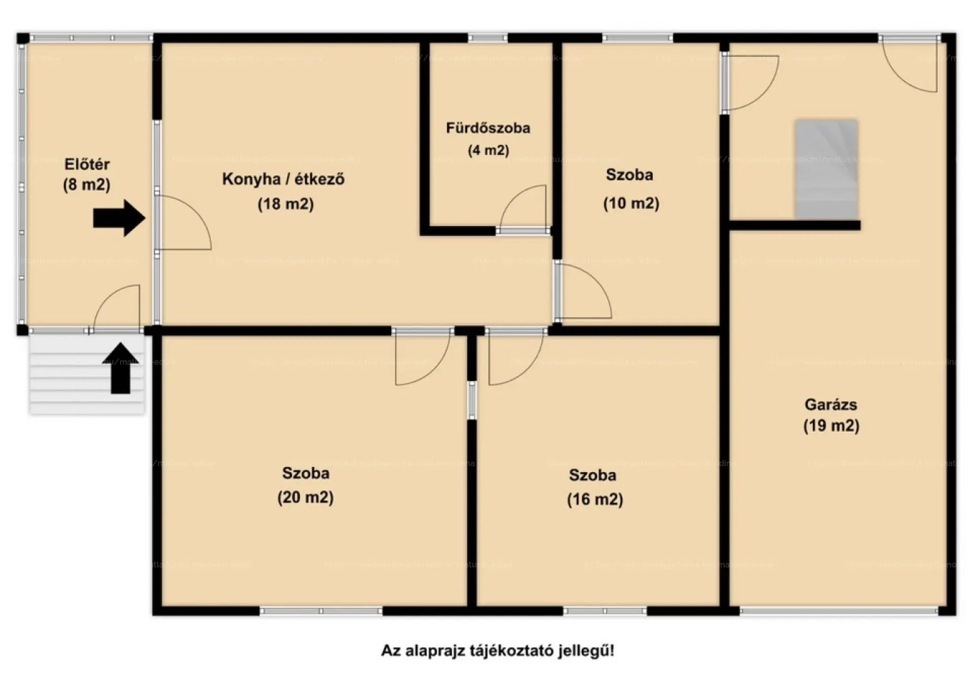 A tágas étkező konyhán kívül 2 nagy méretű (20 és 16 m2-es) szobával, továbbá egy kisebb (10 m2-es) szobával rendelkezik. A fürdőszoba zuhanyzós.
