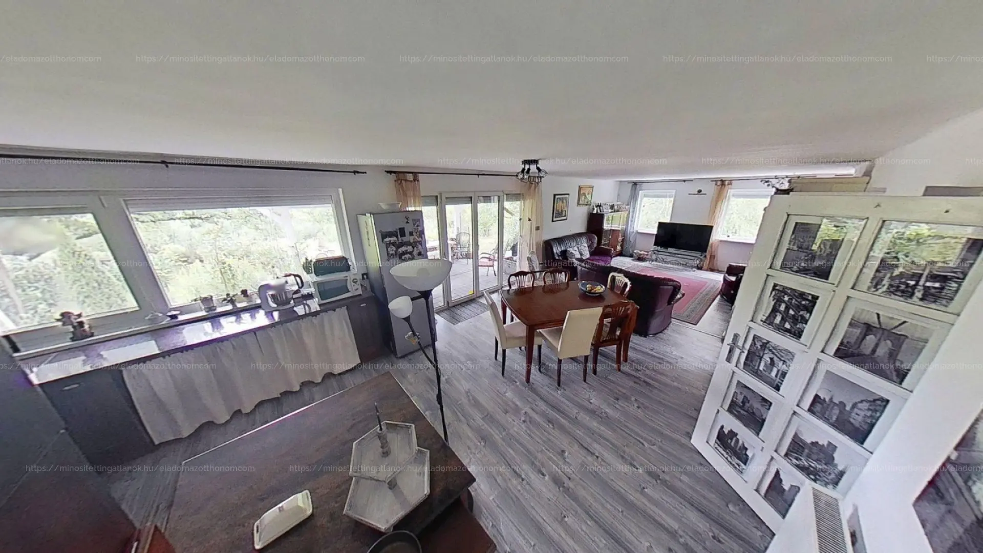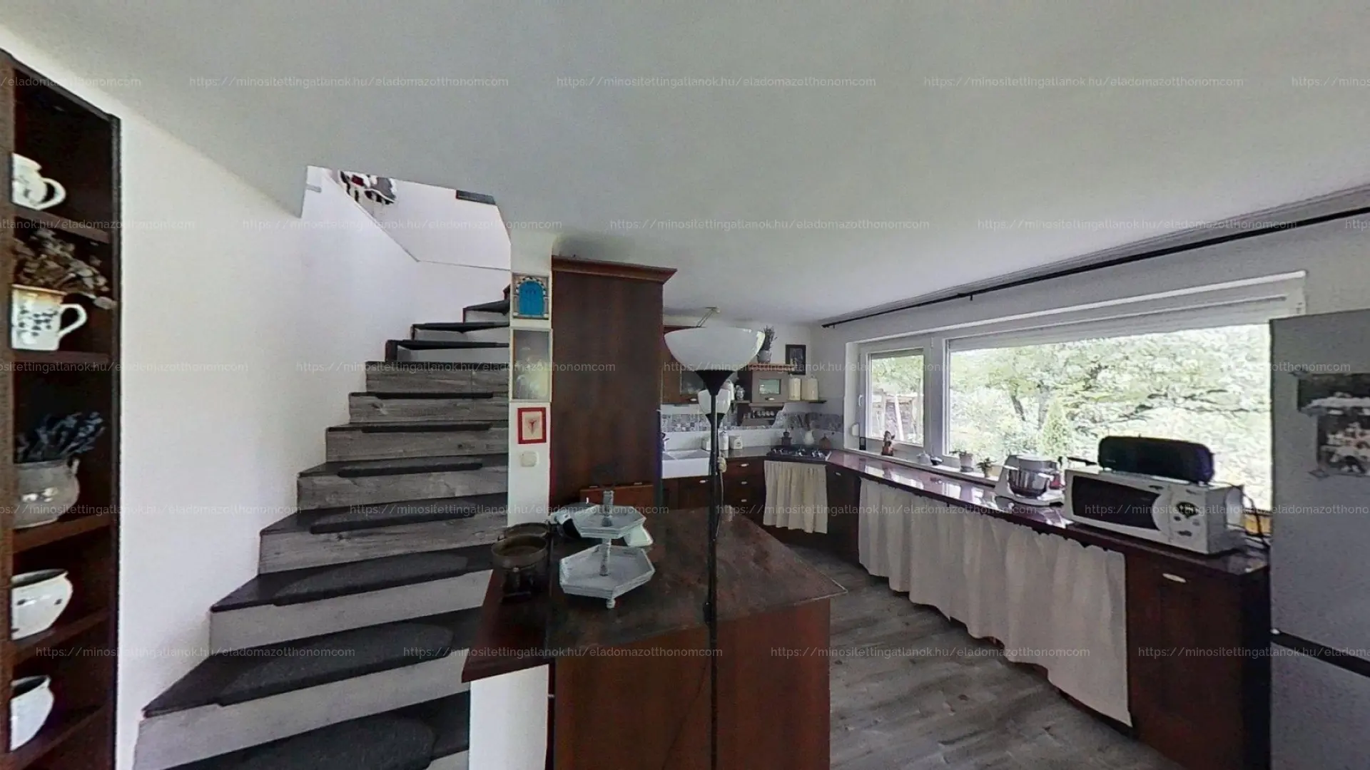 A kétszintes ház földszintjén nagy nappali, konyha, háló- és egy ebből nyíló fürdőszoba, egy külön wc és előszoba osztozik. A konyha bár egy légtér a nappalival, mégis jól elszeparált a nappali életterétől. A nappalinak van egy kisebb, hangulatos része, amit akár le is lehet választani egy gardróbnak, gyermekszobának, stb., bár kár lenne érte, mert jelenleg nagyon jó olvasó/dolgozósarokként működik.