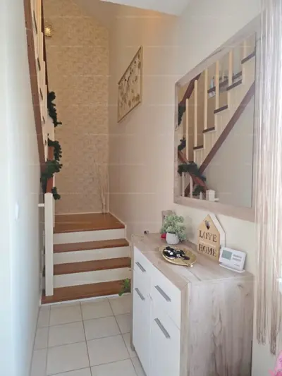 a földszinten: Amerikai konyha, teraszkapcsolatos nappali, 1 hálószoba fürdőszobával, előszobából külön wc-vel, a felső szinten: 3 hálószoba, fürdőszobával;