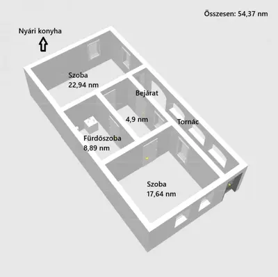 A ház 54 nm, nyári konyha 35 nm, jurta 50 nm, + 2 db garázs, + 1db melléképület, + 1 db pince.