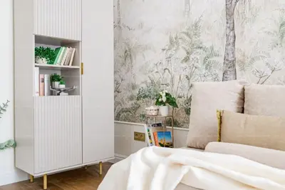 A lakásban következetesen a természet színei, a föld, a fű zöldje, ég kékje kerültek felhasználásra, fűszerezve elegáns arany kiegészítőkkel a tökéletes összhang érdekében.