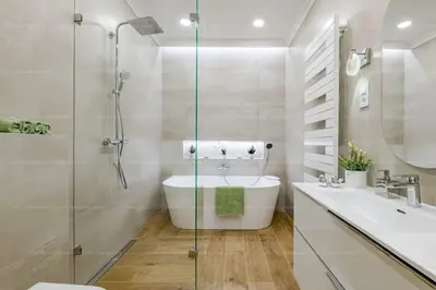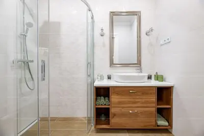 Mellette található egy komplett fürdő zuhanyozóval, mosdó és WC beépítésével, melyek használati értékét méretre gyártott szekrények is emelik.