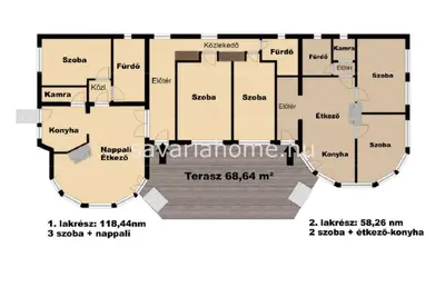 A 2. lakrész 58,28nm alapterületű, 2 szobával, és egy modern, gépesített konyhabútorral felszerelt konyha-étkezővel, tágas fürdőszobával, kamrával és előtérrel. Ebben a lakrészben is van egy cserépkályha és egy hűtő fűtő klíma is, de a padló és falfűtés itt is rendelkezésre áll.