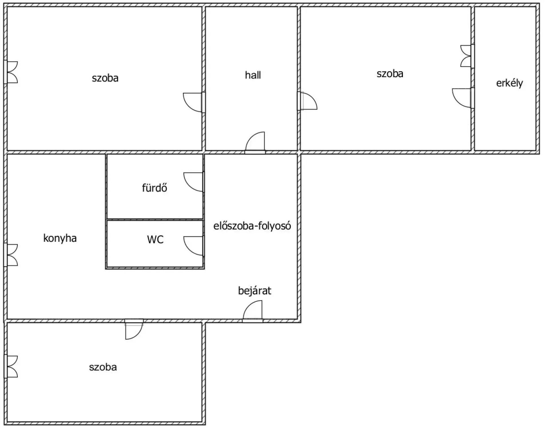 A lakásban 3 külön bejáratú szoba, előszoba-folyosó, konyha, fürdőszoba és külön WC található.