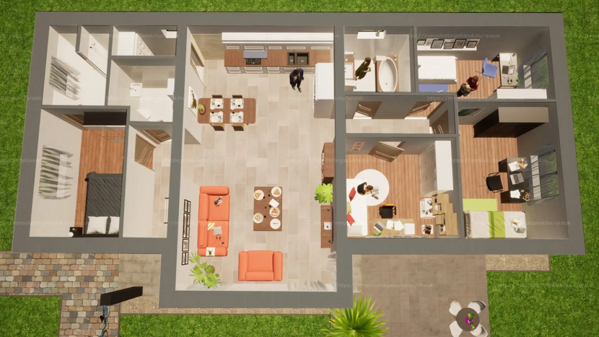 Maximálisan kihasznált terek, rendkívül praktikus elrendezés és magas műszaki tartalom jellemzi az ingatlant. Elrendezése: Előtér, amerikai konyha nappalival, kamra, háztartási helyiség, fürdőszoba és 3 hálószoba.