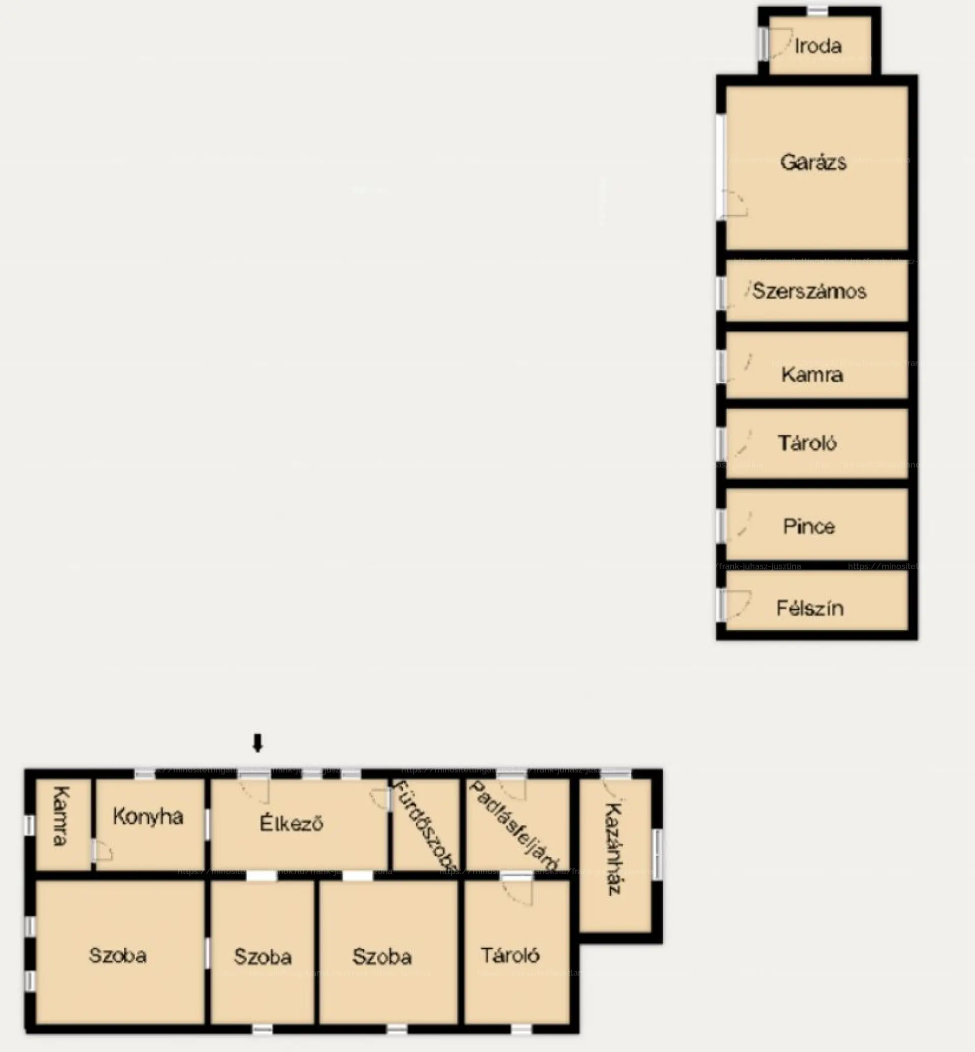 • pince, kamra, szerszámos, tárolók, irodának kialakított helyiség
