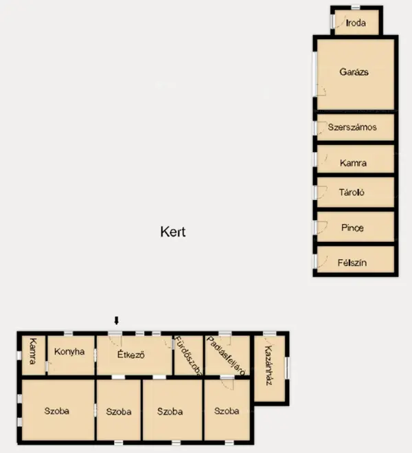 • pince, kamra, szerszámos, tárolók, irodának kialakított helyiség
