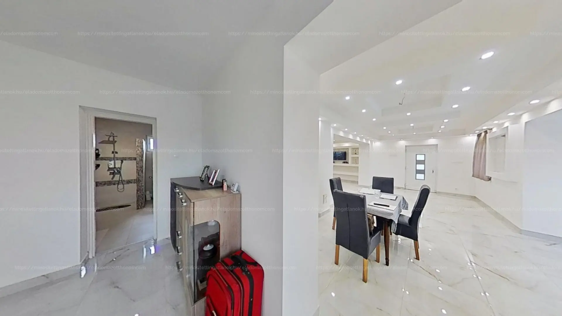 Az utcafrontról jutunk be az épületbe egy fedett 14 m2-es előtéren keresztül. A központi részben egy tágas előtér-étkező és nappali található. Innen nyílik az utca felé egy hálószoba és egy hozzá tartozó fürdő, valamint egy hátső épületrész is, amely 2 hálószobát és további egy fürdőszobát foglal magába. A nappali és a hálók között egy háztartási helyiség és egy kamra is praktikusan helyett kapott. A keresztirányú épületrész a konyhát tartalmazza, ahonnan további 14 m2-es terasz nyílik az oldalkert irányába. A szobák méreteiről, belső elosztásukról a hirdetéshez mellékelt virtuális séta ikonra kattintva kaphat teljes képet.
